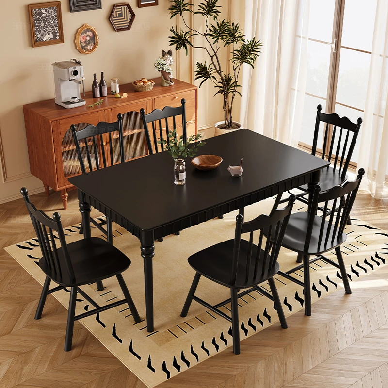メイリジャン アンティーク風の無垢材ダイニングテーブル椅子セット 狭いお部屋にもぴったりな四角いテーブル フレンチスタイルの人気デザイン ブラックカラーのオシャレなレストラン用テーブル
