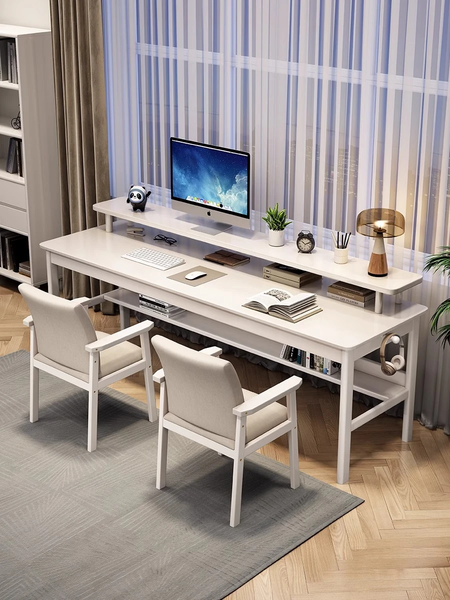 ミニマルデザインの悦米優品!実木製のダブルデスク&ラック一体型、スタイリッシュなパソコンデスク。オフィスや家庭で使える学生用ライティングテーブルとチェアで、効率的な学習スペースを実現!