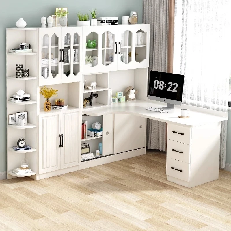 ベイジュー無垢材コーナーデスク&書棚一体型シンプルデザイン|学生のための快適な学習空間を実現!書庫付きコンピューターデスクセット