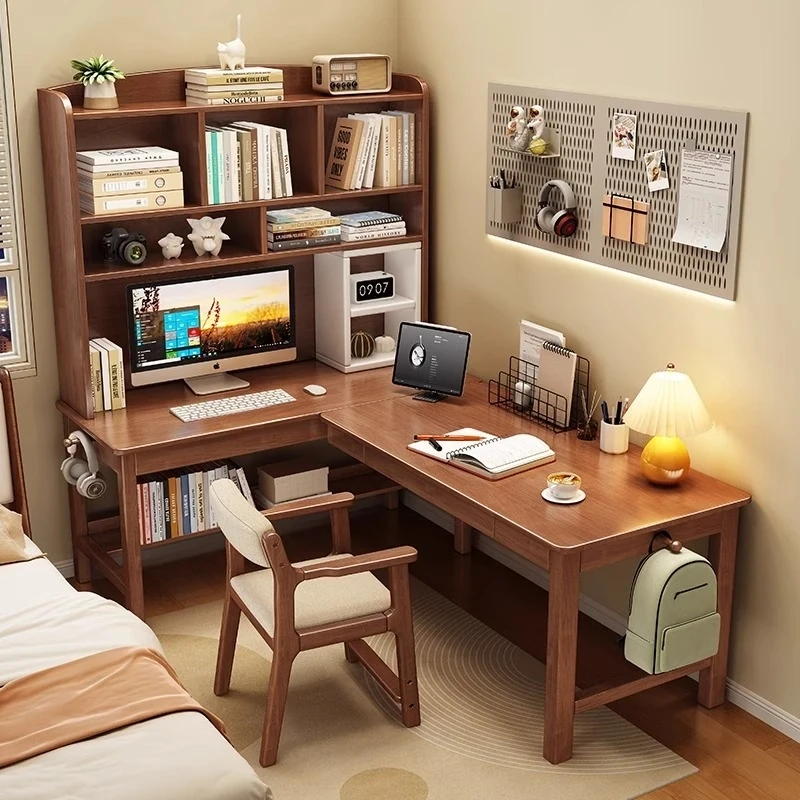 豪華な無垢材使用のコーナーデスク兼書棚|壁にぴったりの7字L型デザイン|自宅の書斎や寝室に最適!おしゃれで機能的な空間を演出します。