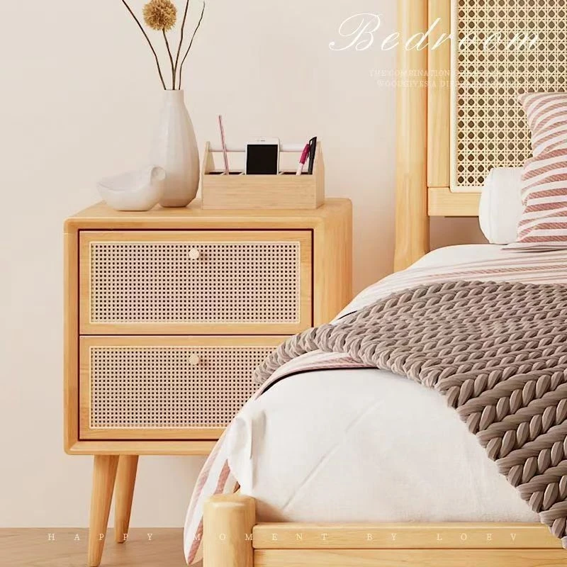 Nordic Style Solid Wood Rattan Bedside Table – Minimalist Modern Storage Cabinet, Japanese-Inspired Side Table for Guesthouses, Compact Storage Solution for Small Spaces