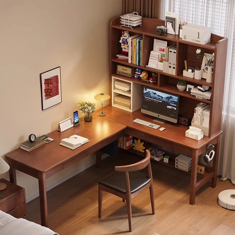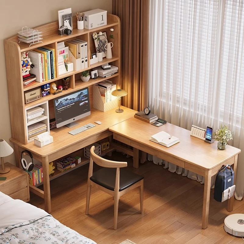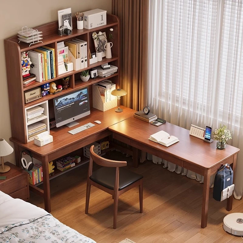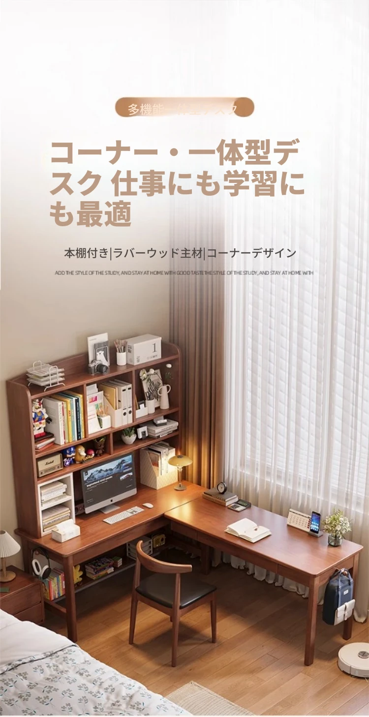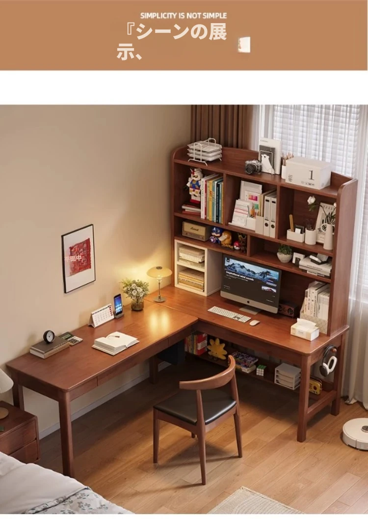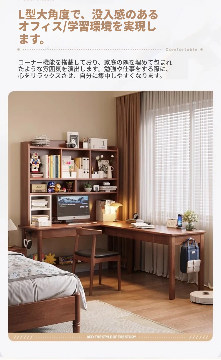 豪華な無垢材デスク&本棚一体型|省スペースのL字型コンピューターデスク|小型住宅に最適|寝室やダイニングにぴったりな2人用コーナー家具