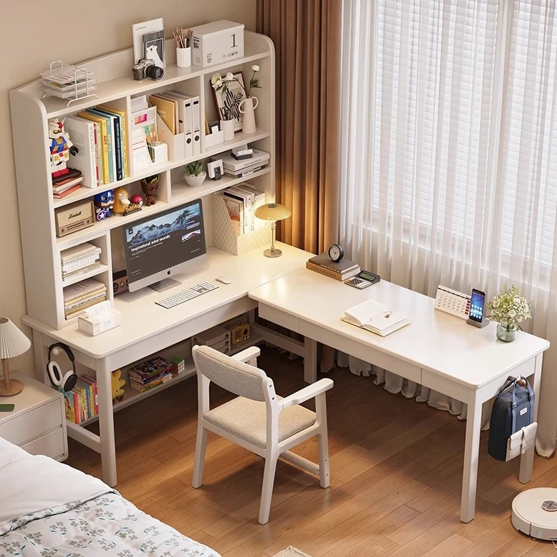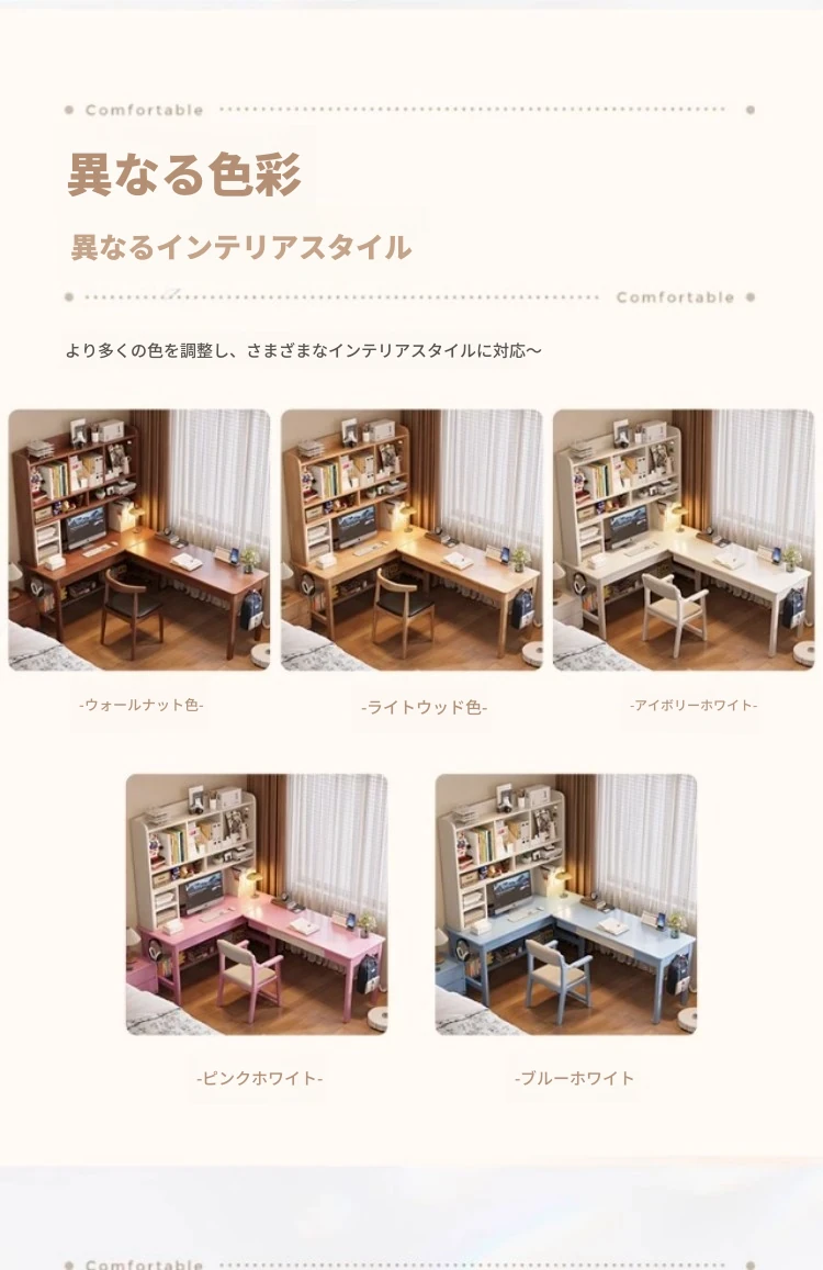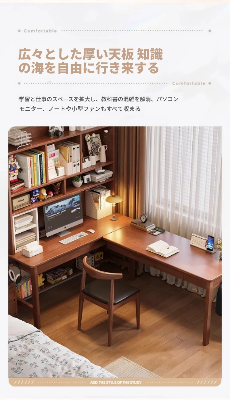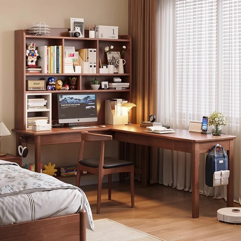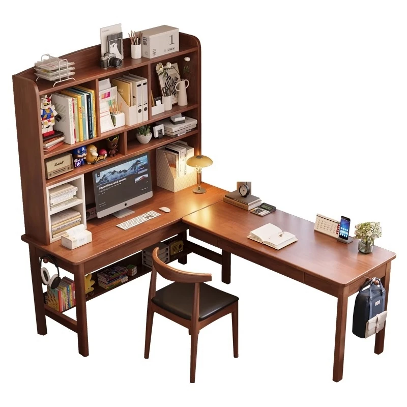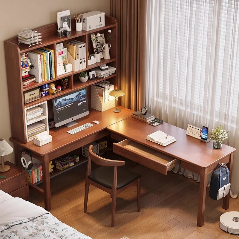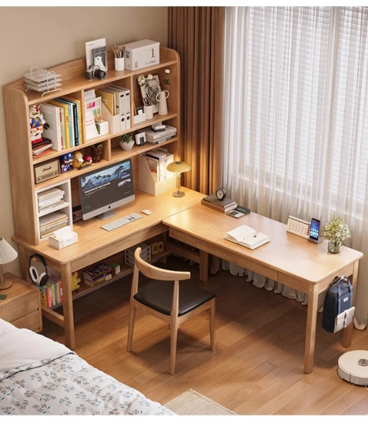 豪華な無垢材デスク&本棚一体型|省スペースのL字型コンピューターデスク|小型住宅に最適|寝室やダイニングにぴったりな2人用コーナー家具