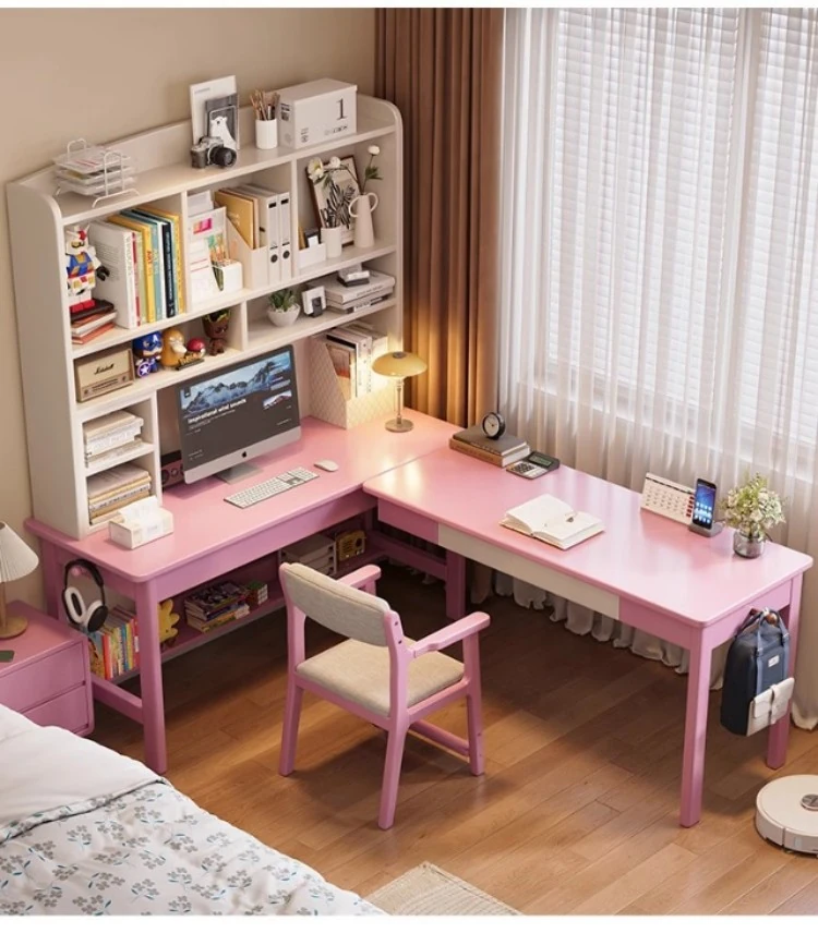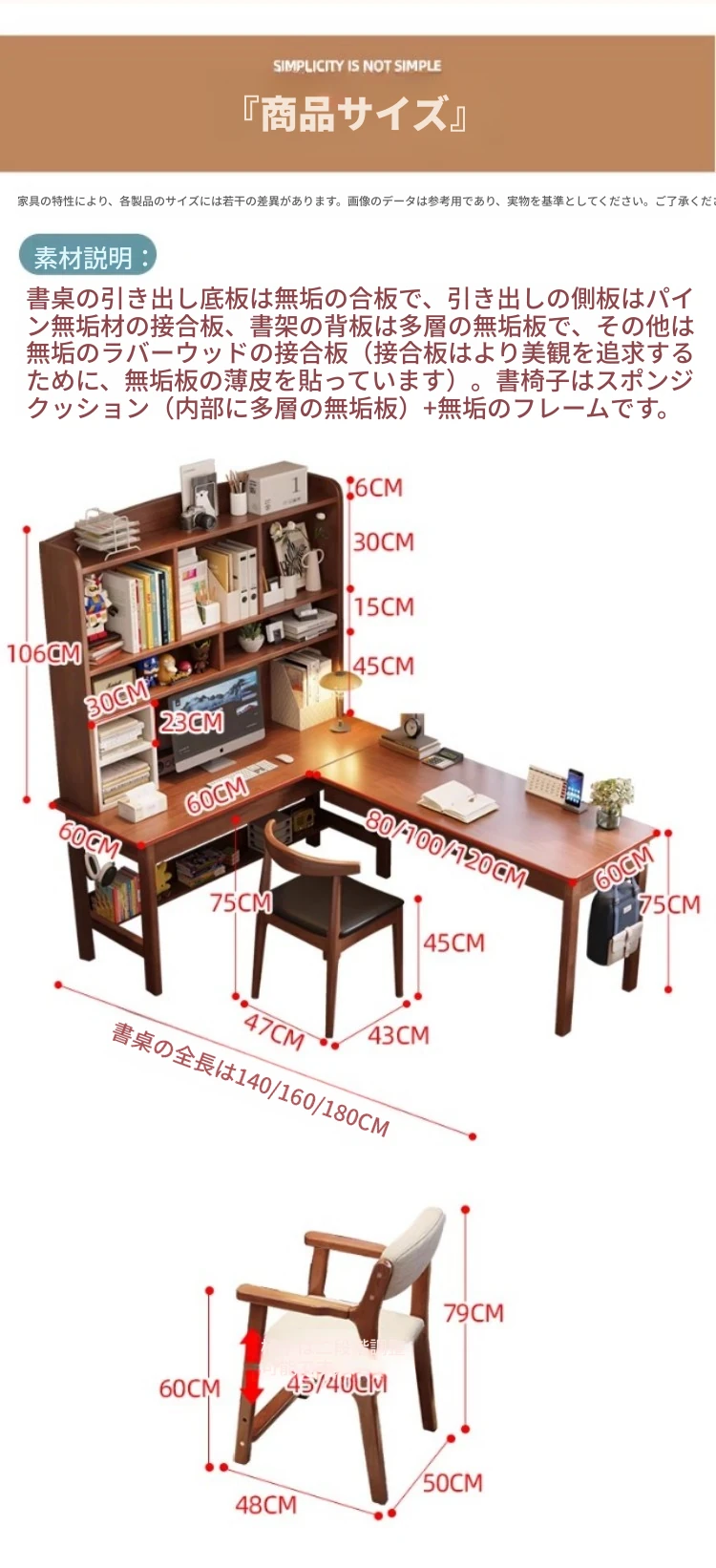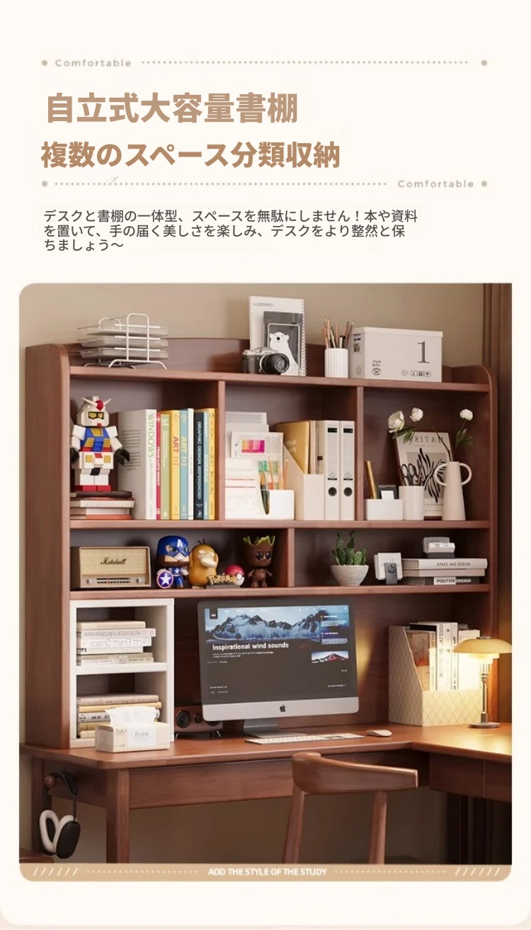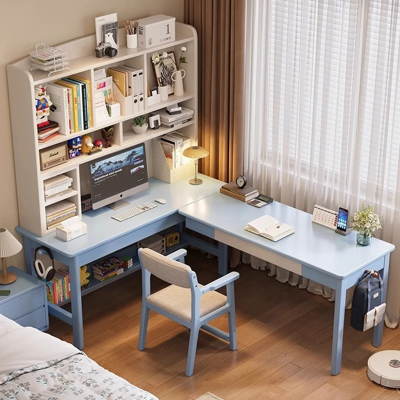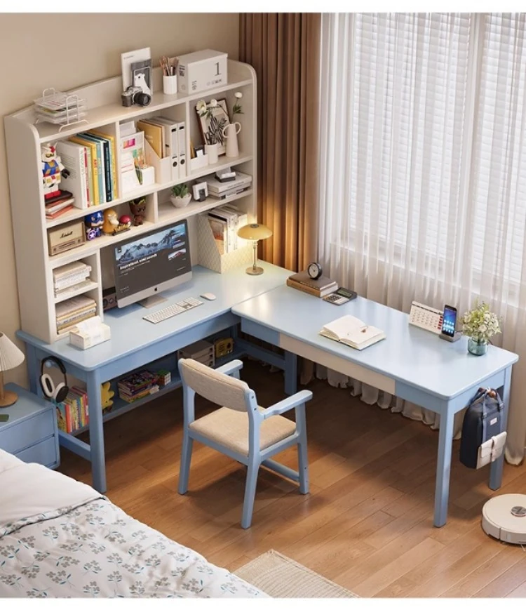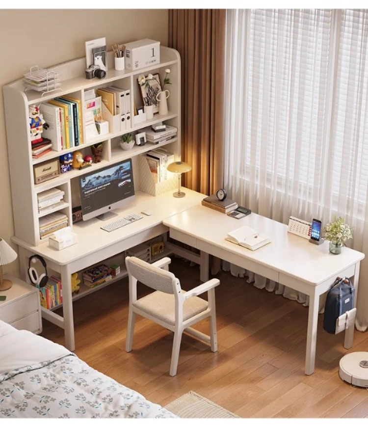 豪華な無垢材デスク&本棚一体型|省スペースのL字型コンピューターデスク|小型住宅に最適|寝室やダイニングにぴったりな2人用コーナー家具