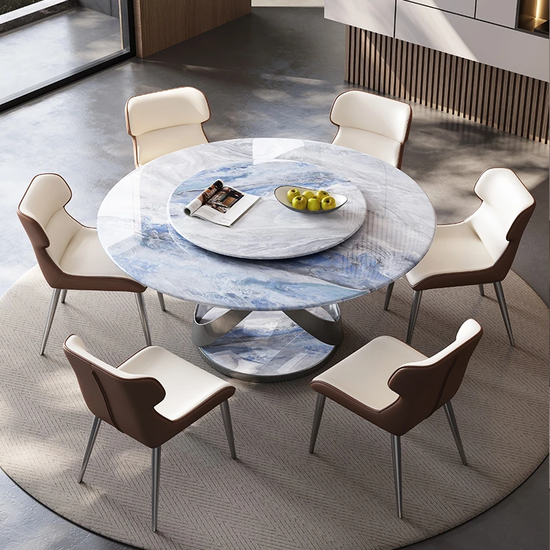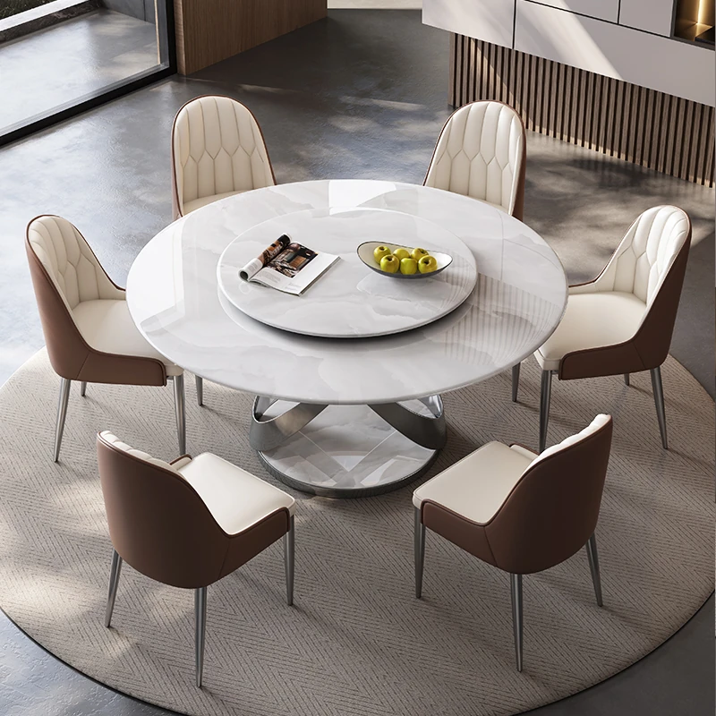 【岩板】808#円卓+回転盤+6脚猫爪皮パイナップル椅子