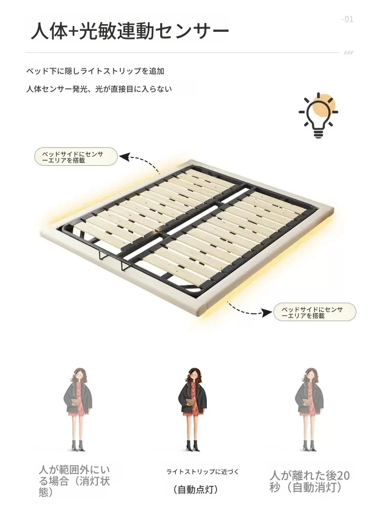 【スチールウッドスラットフレーム】ライト付きシングルベッド + 9ゾーン静音カシミヤ独立ポケットラテックスマットレス