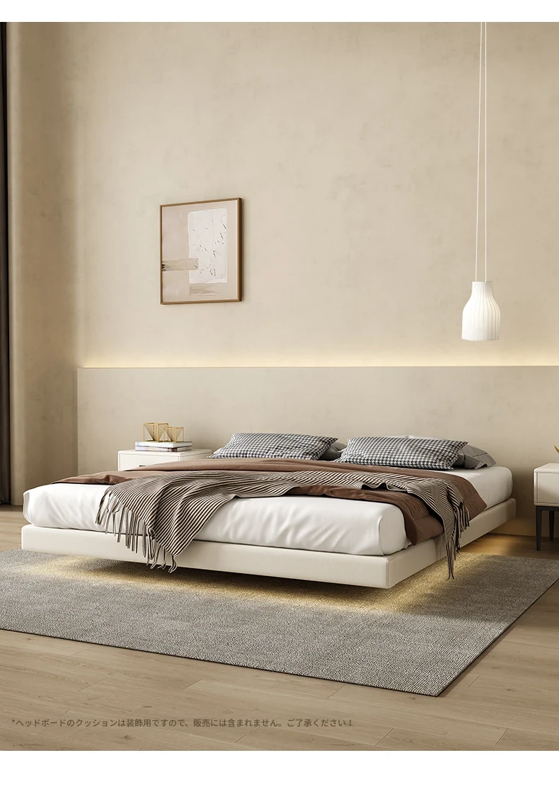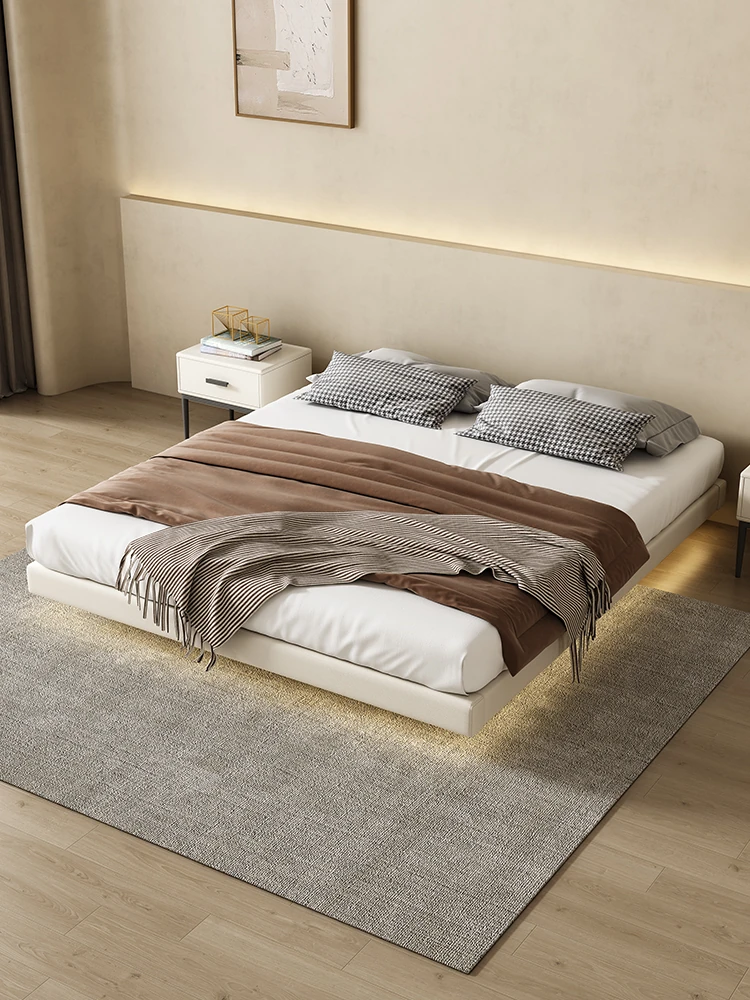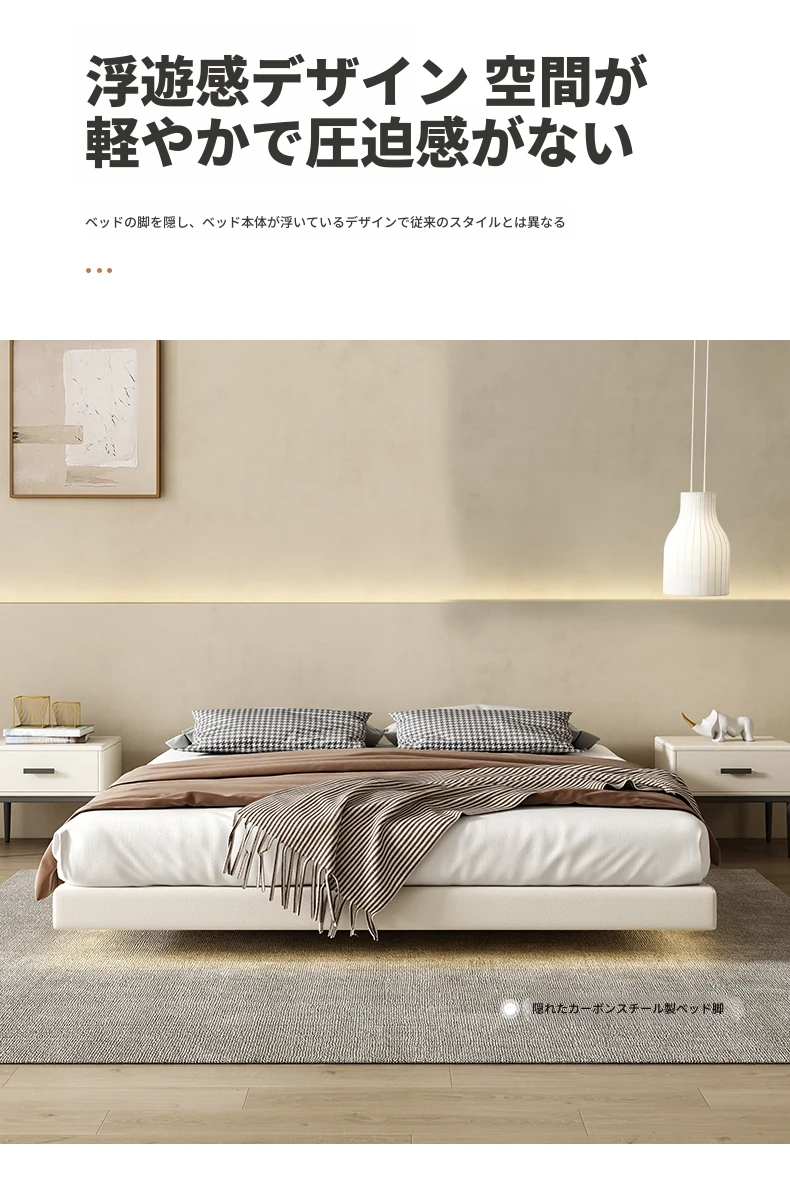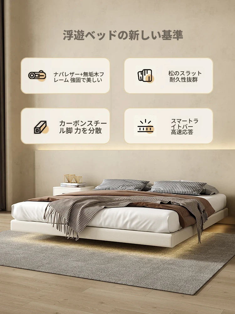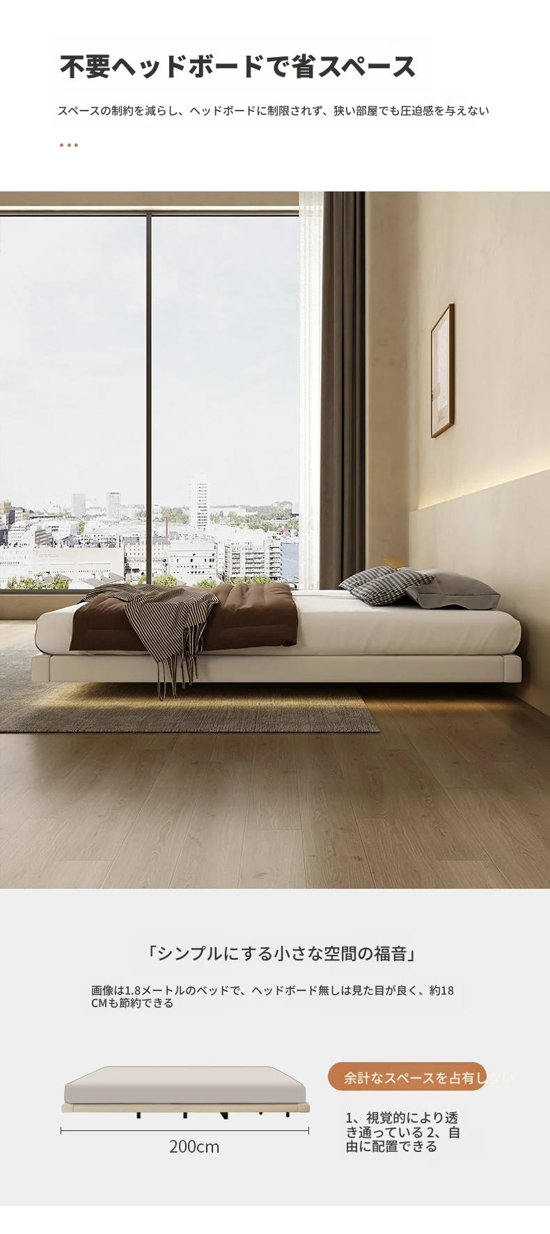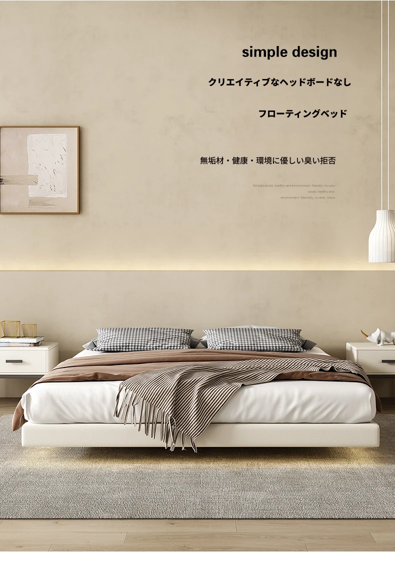 南奢北華のヘッドボードなし浮遊ベッド - モダンでシンプルなデザインの主寝室用軽奢大床。収納機能付き、本革ベッドと浮遊感のある無垢材ベッドで、心地よい空間を演出!