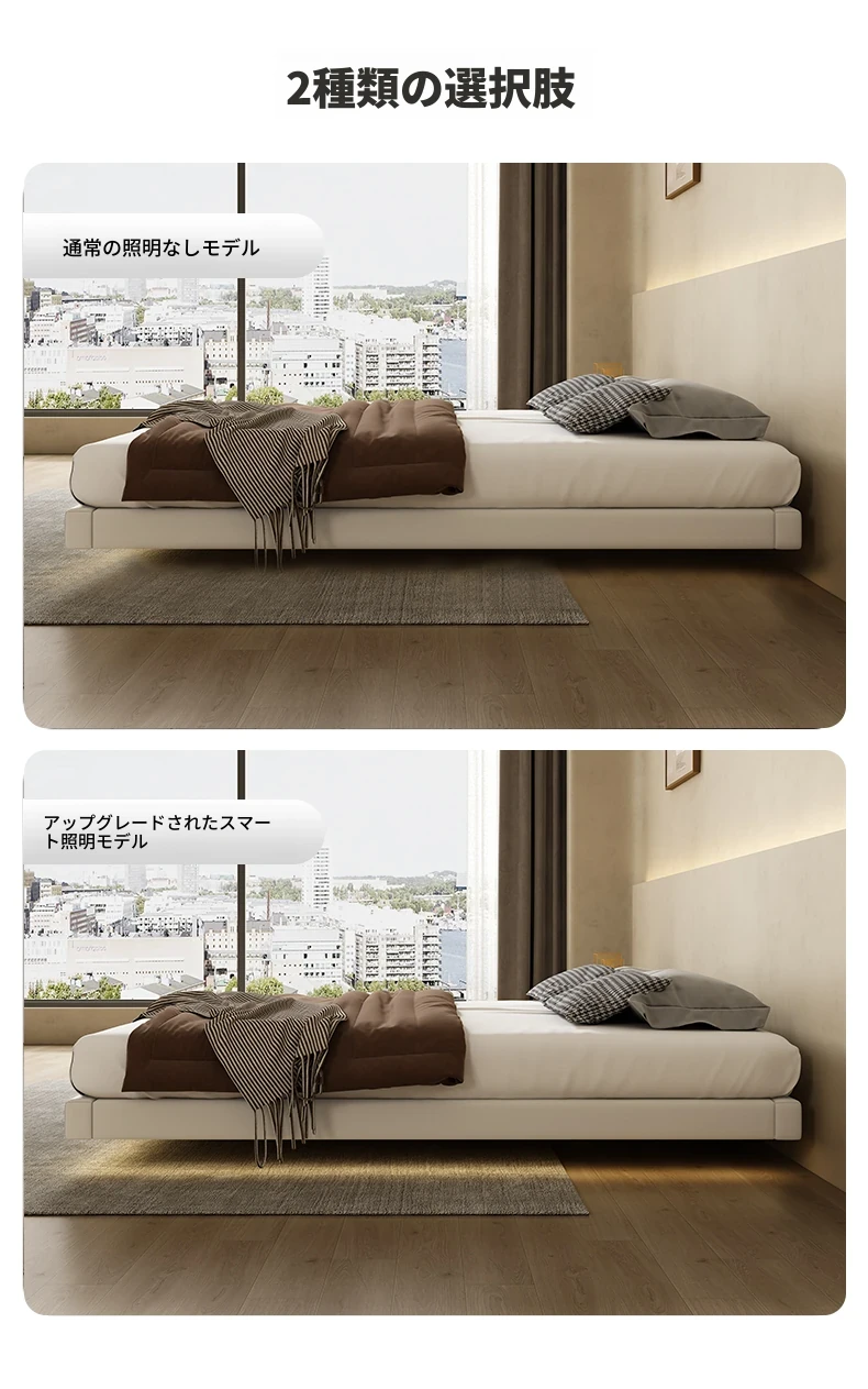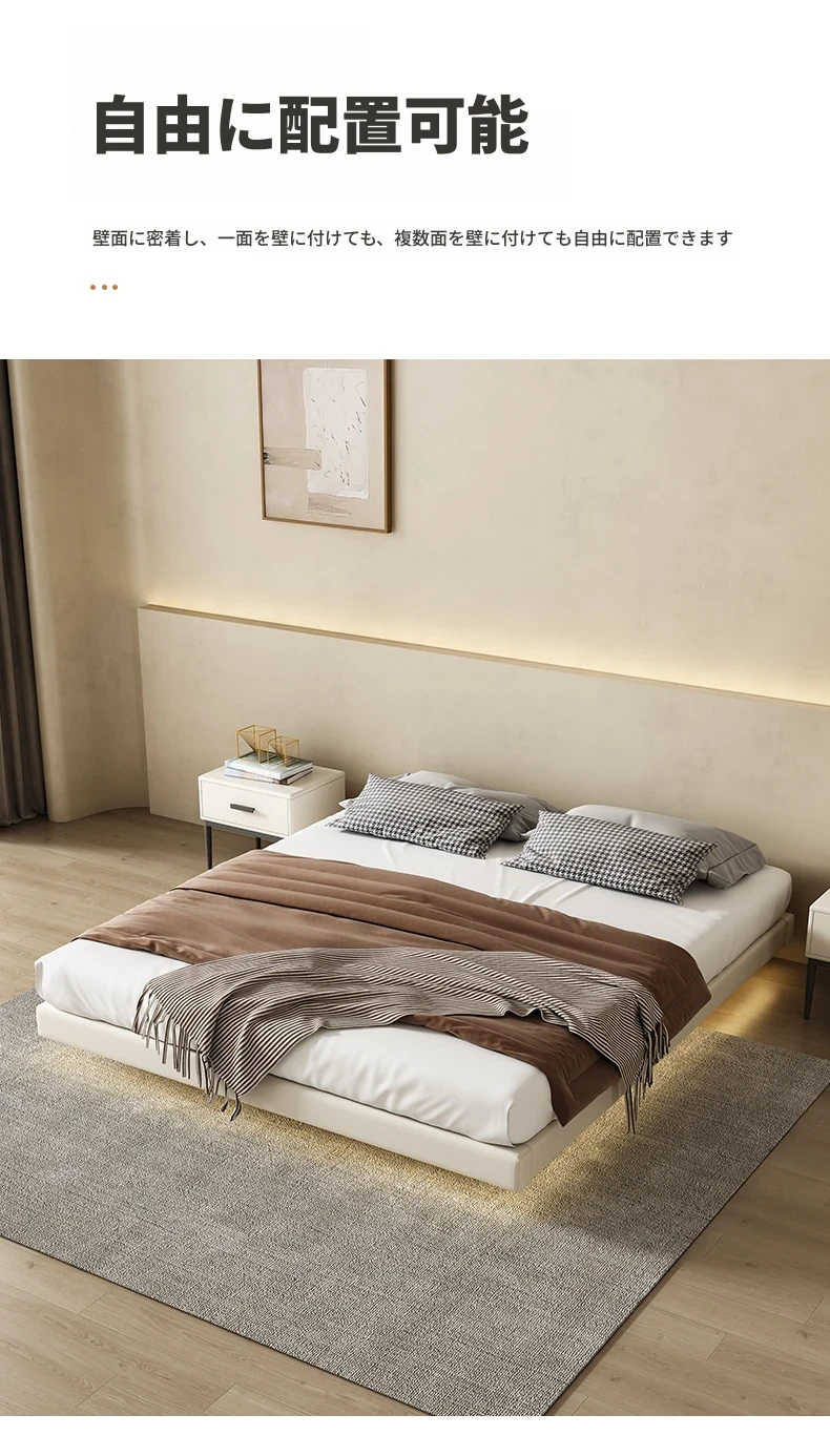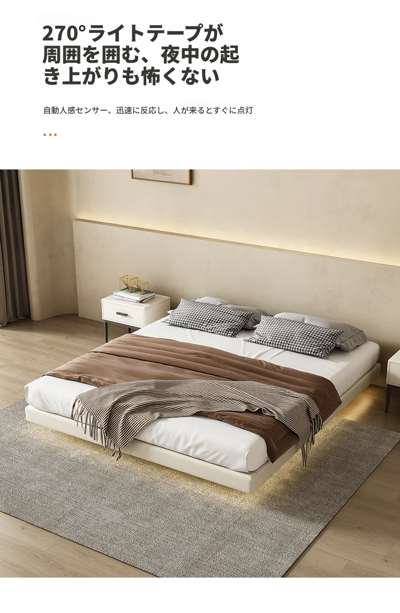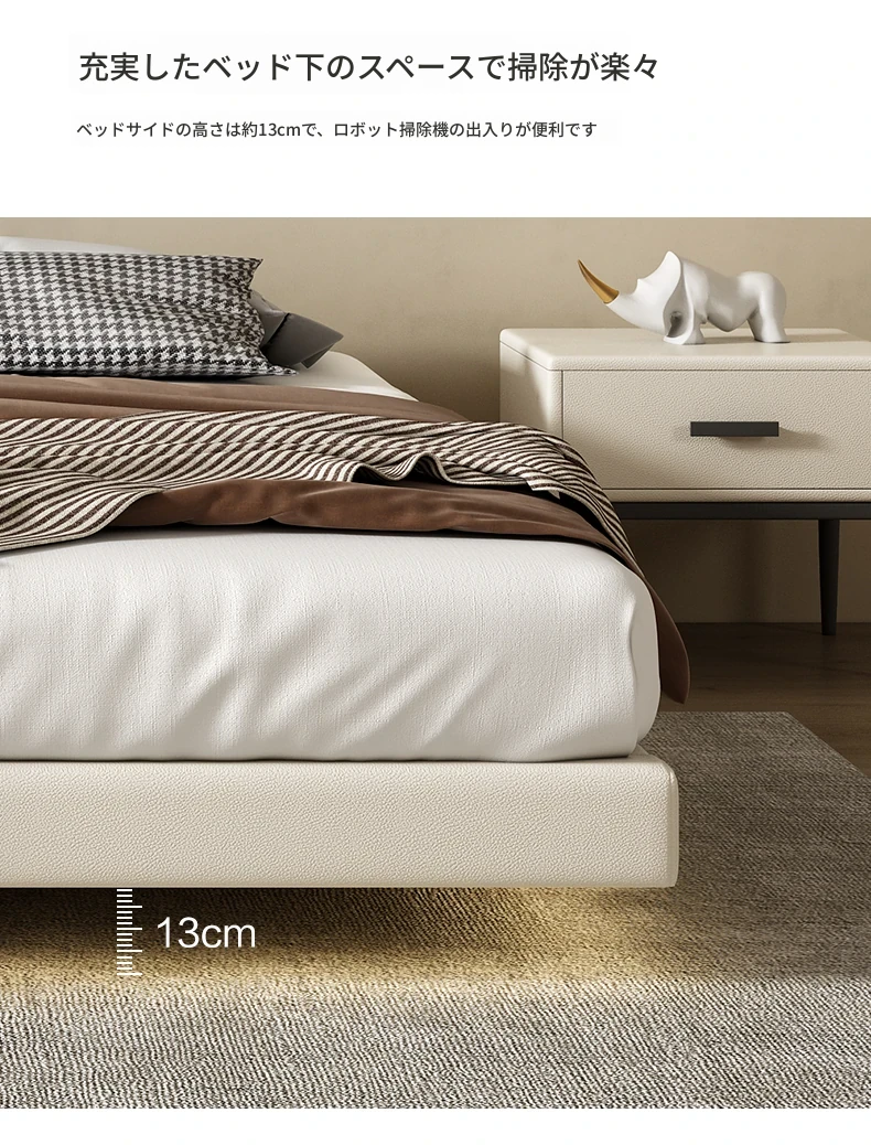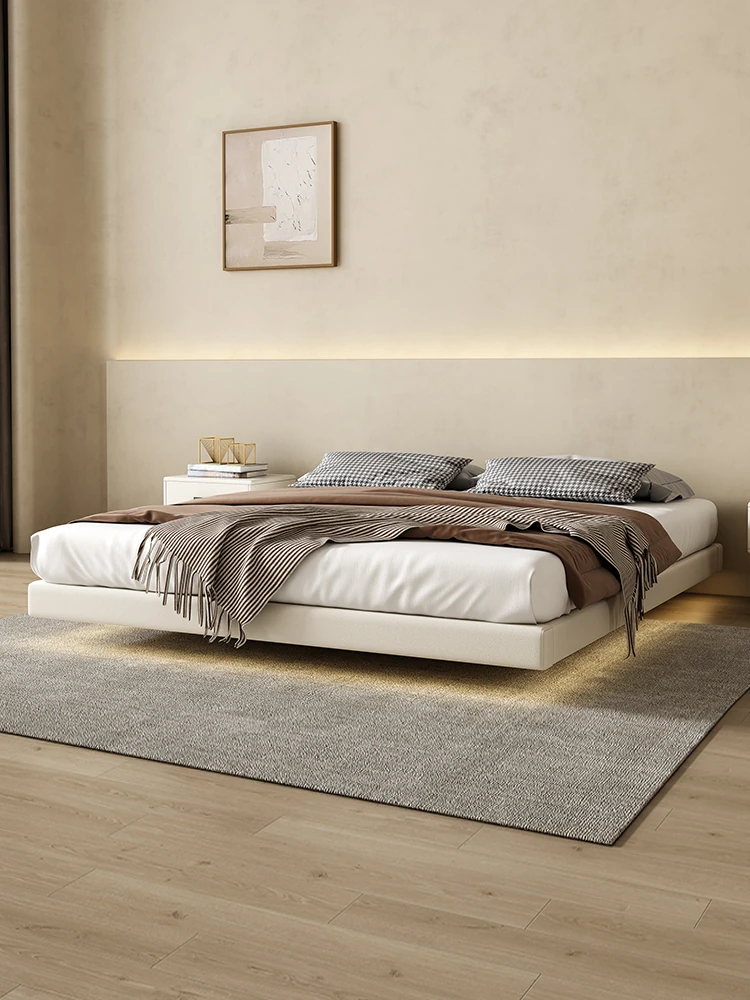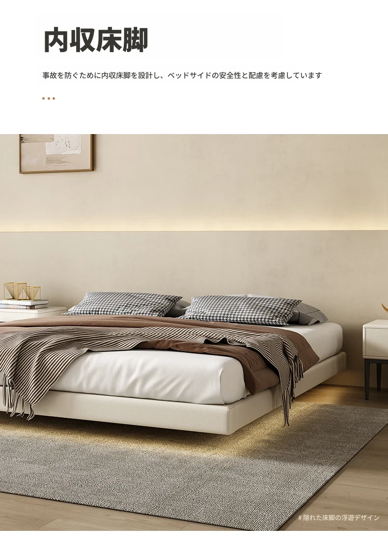 南奢北華のヘッドボードなし浮遊ベッド - モダンでシンプルなデザインの主寝室用軽奢大床。収納機能付き、本革ベッドと浮遊感のある無垢材ベッドで、心地よい空間を演出!