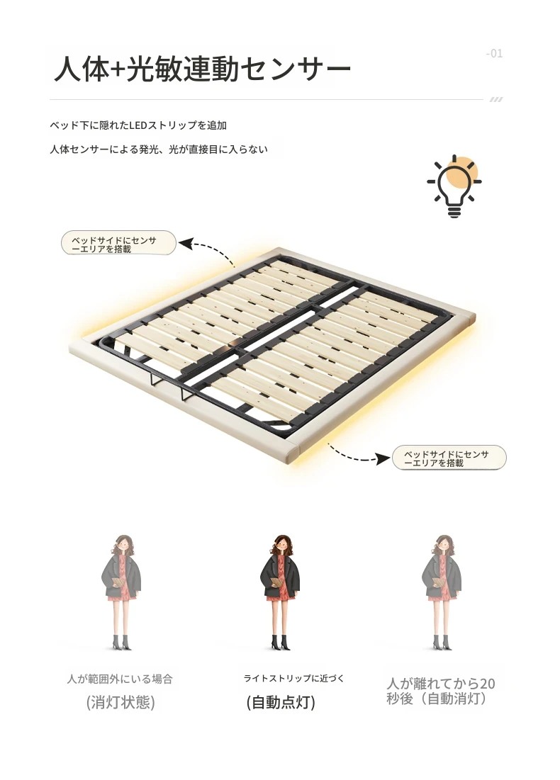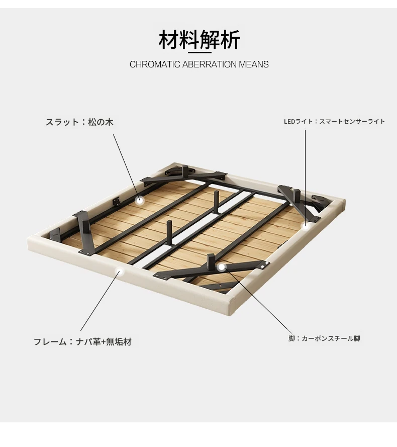 【スチールウッドスプリングフレーム】照明付きシングルベッド + 9ゾーン静音ナチュラルラテックスマットレス