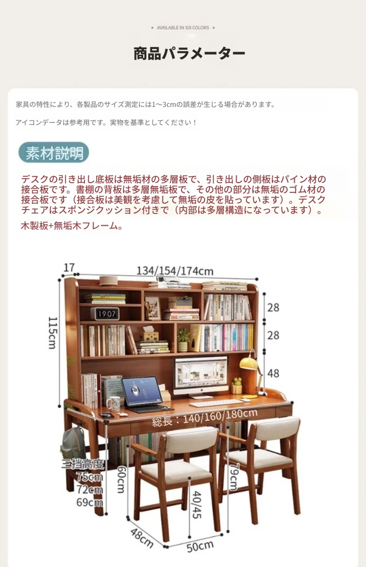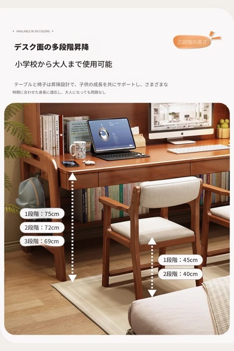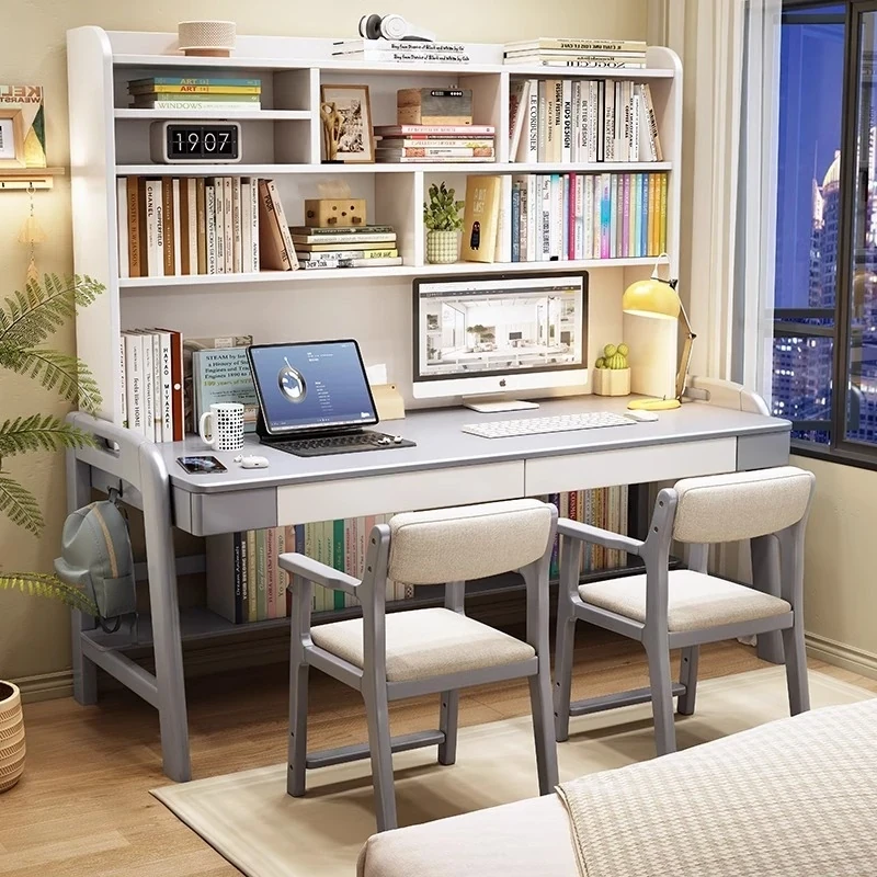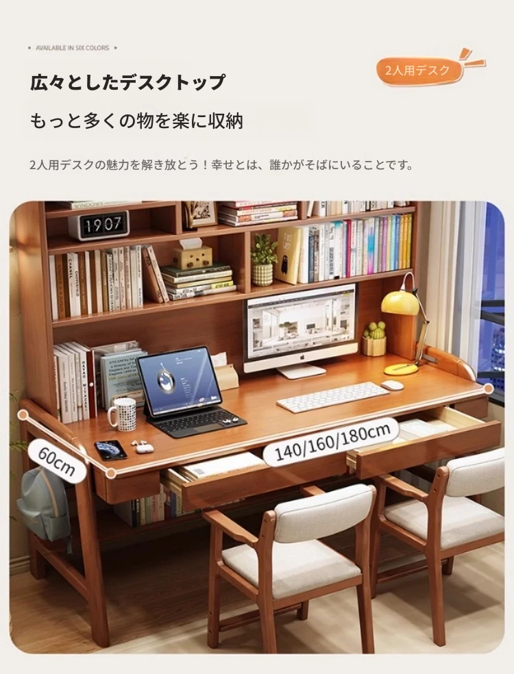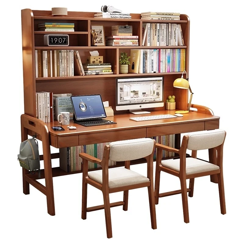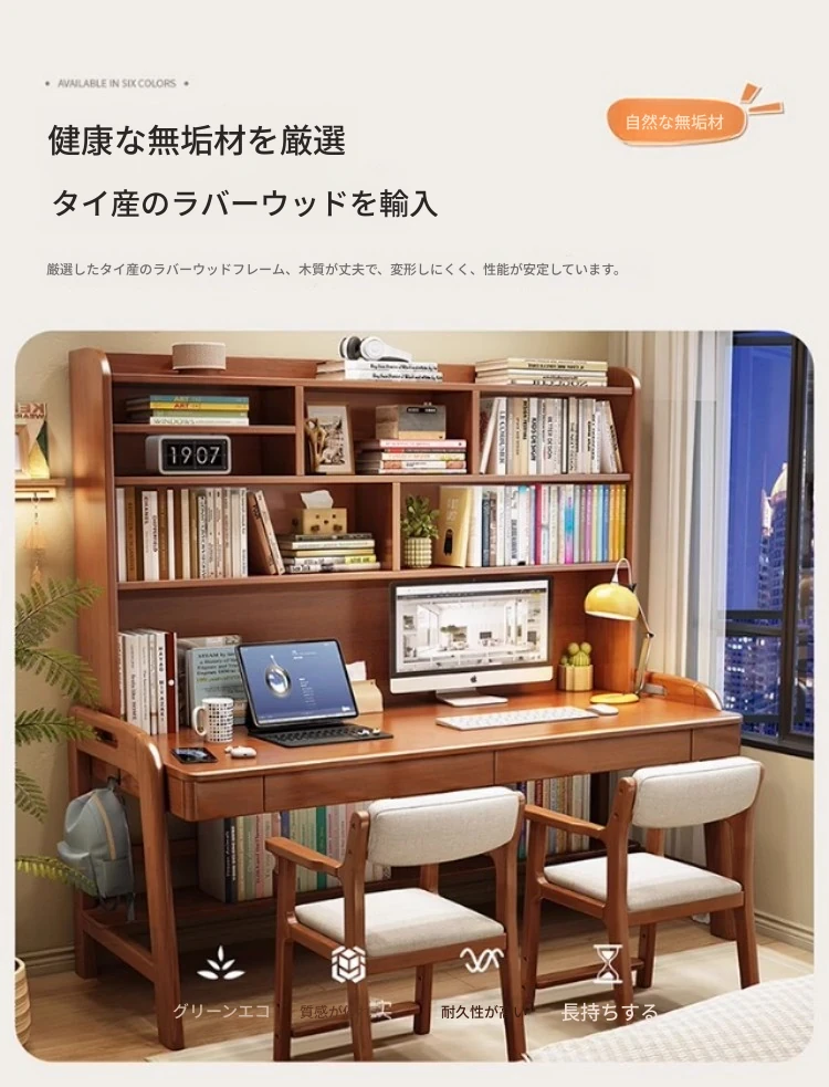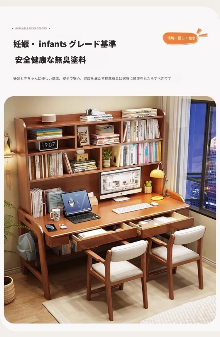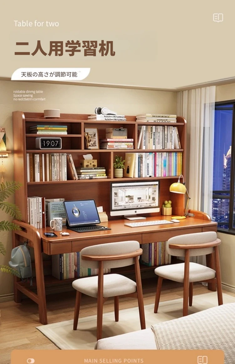 豪華な無垢材ダブルデスク&書棚一体型家用学生向けシンプルモダン昇降学習デスク【机と本棚が一体の機能的デザイン】勉強が楽しくなる理想の空間を実現!