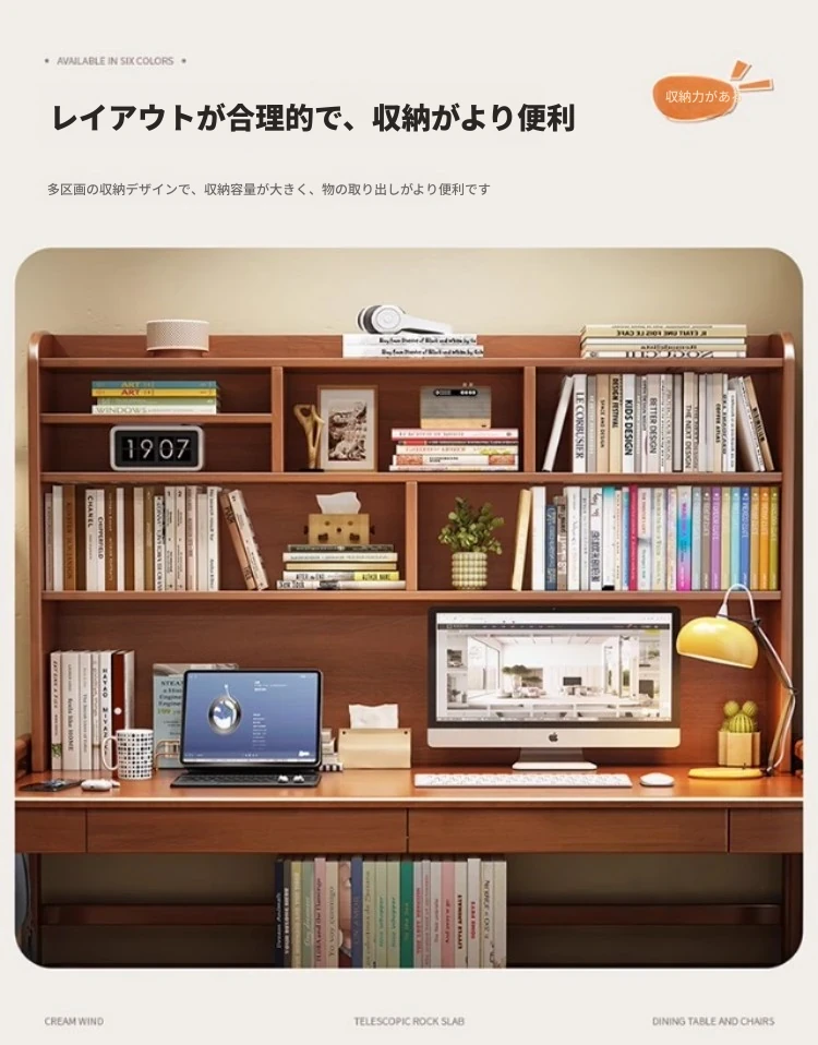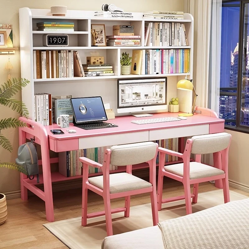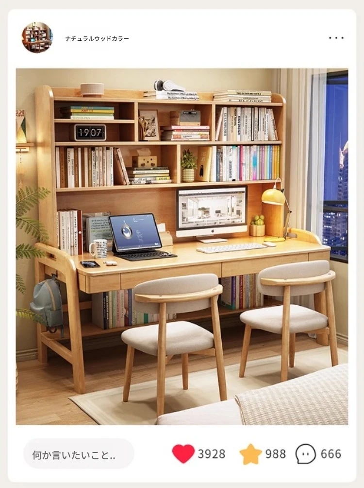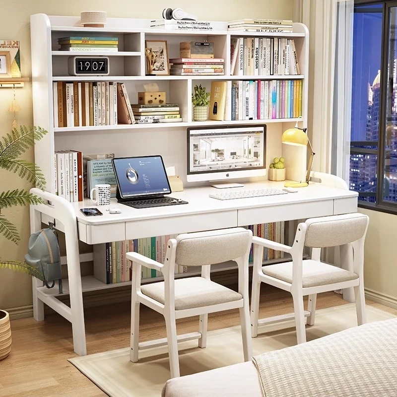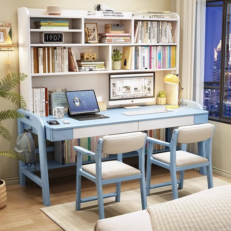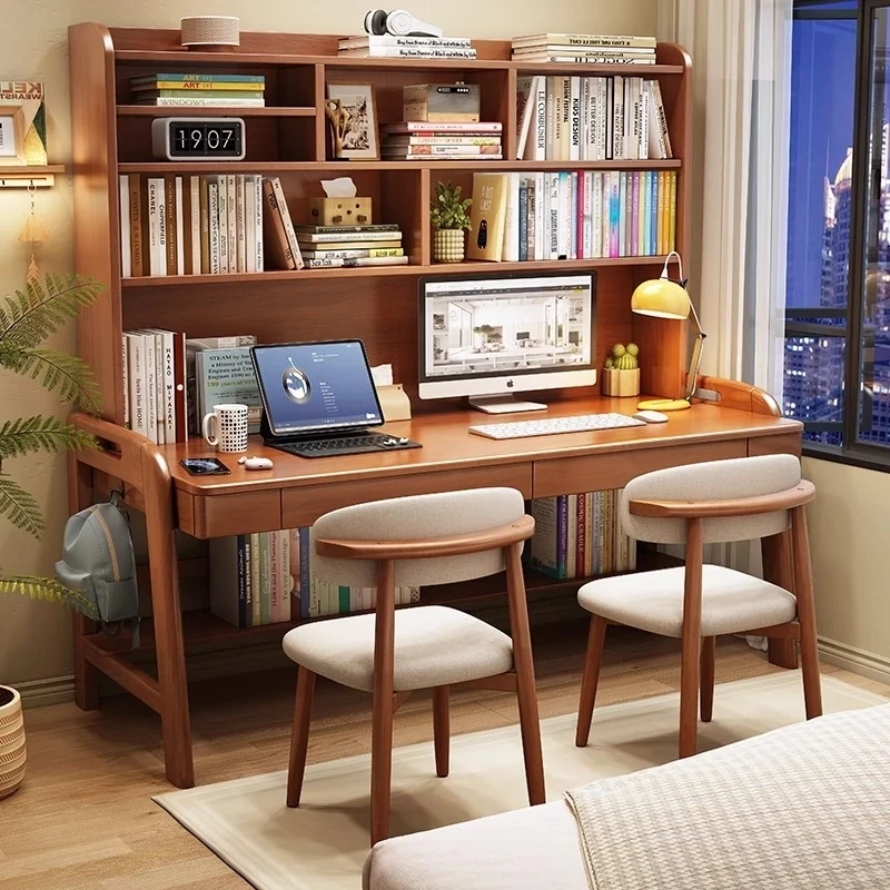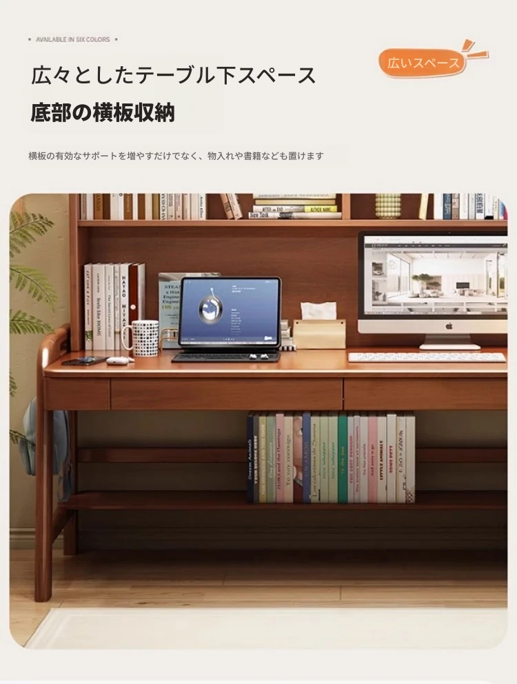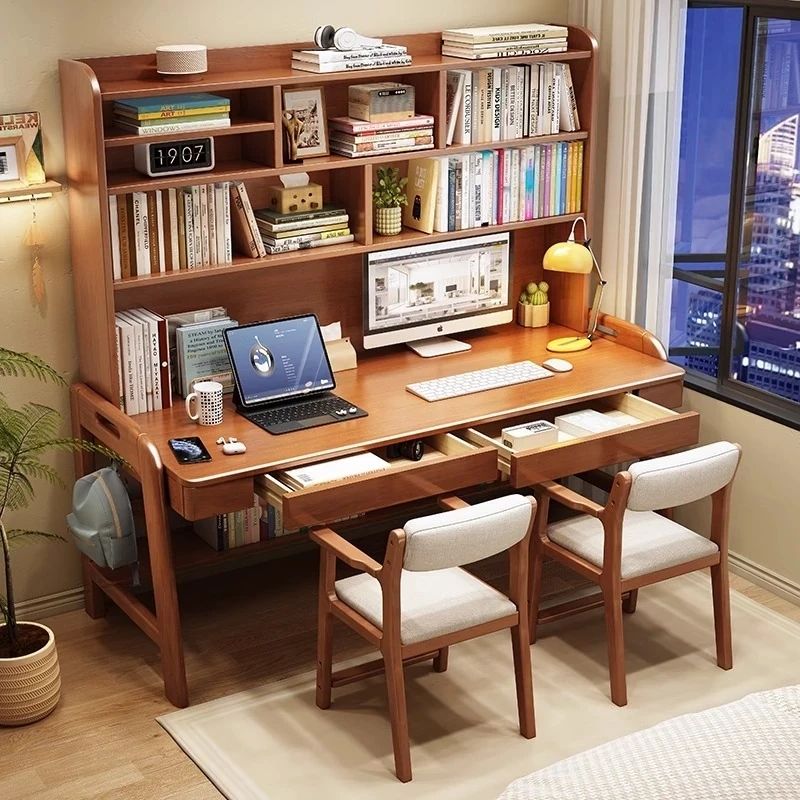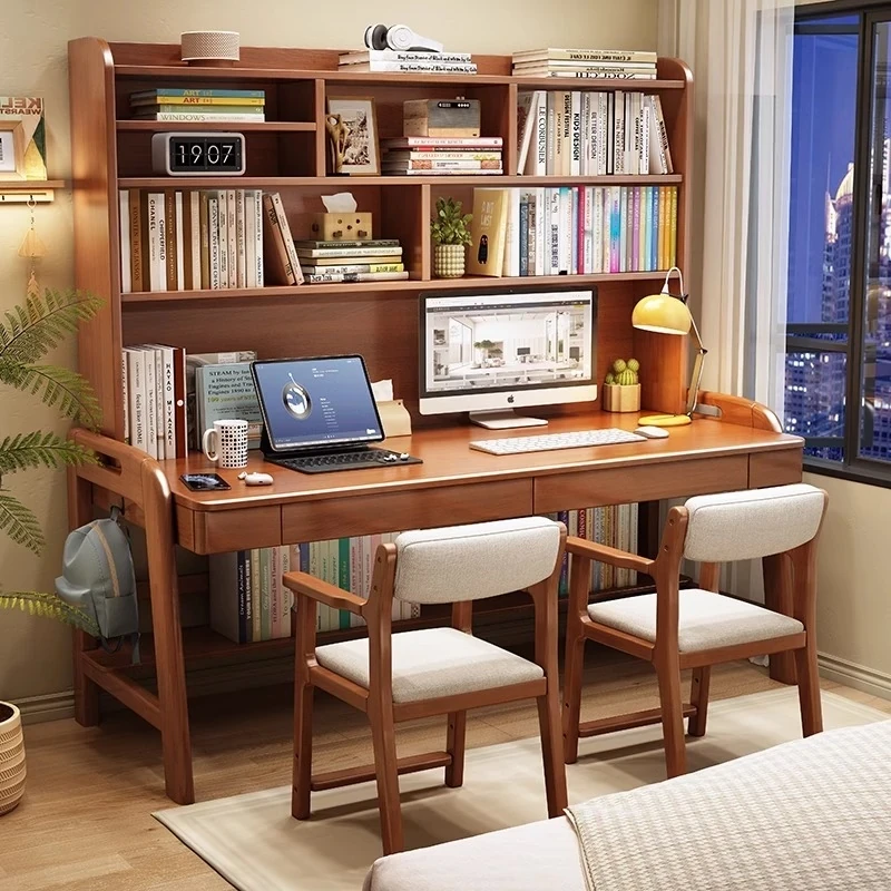 豪華な無垢材ダブルデスク&書棚一体型家用学生向けシンプルモダン昇降学習デスク【机と本棚が一体の機能的デザイン】勉強が楽しくなる理想の空間を実現!