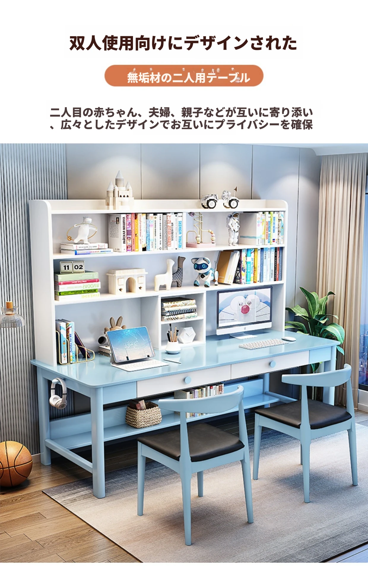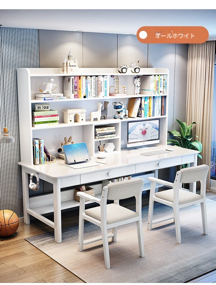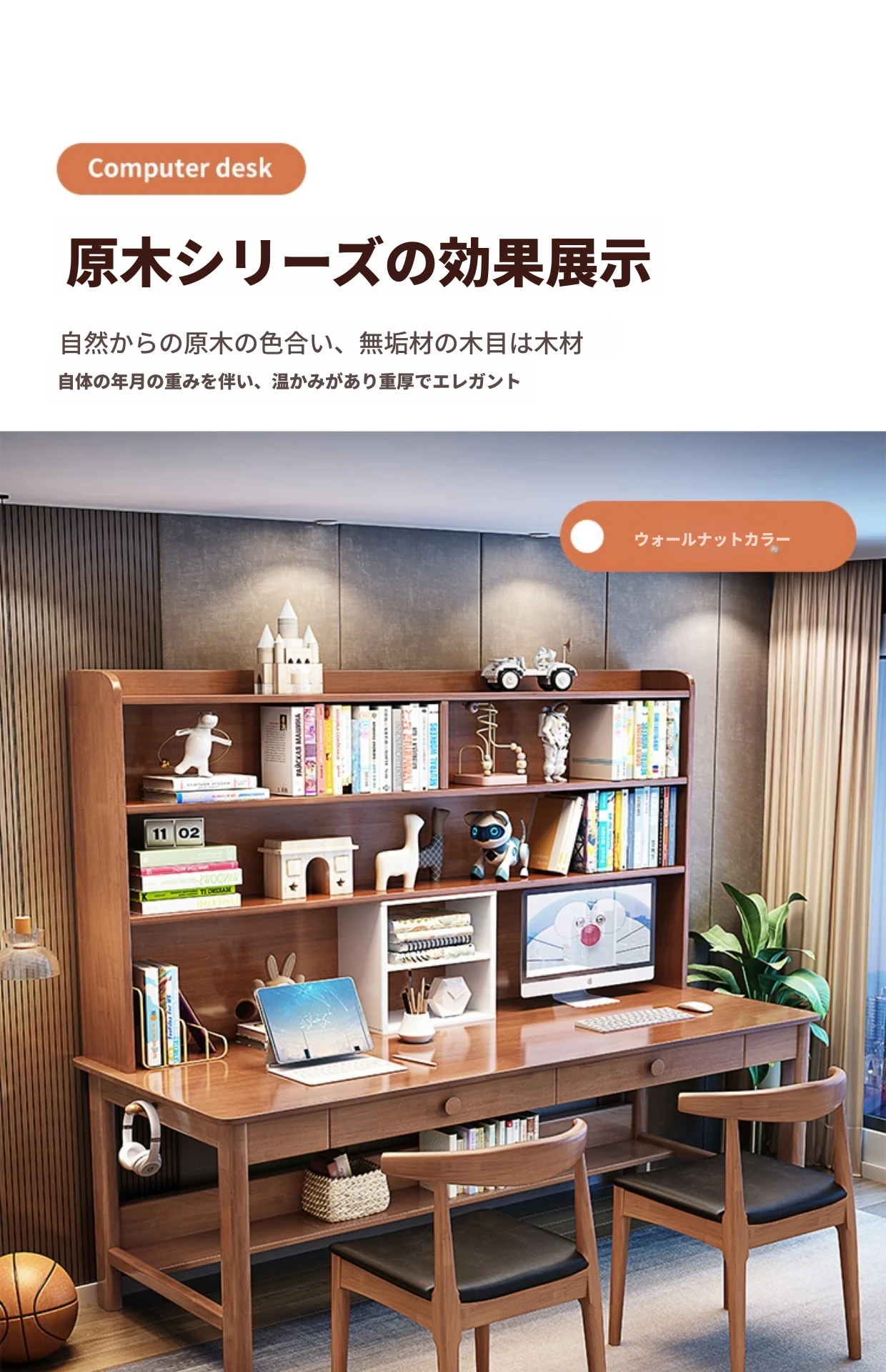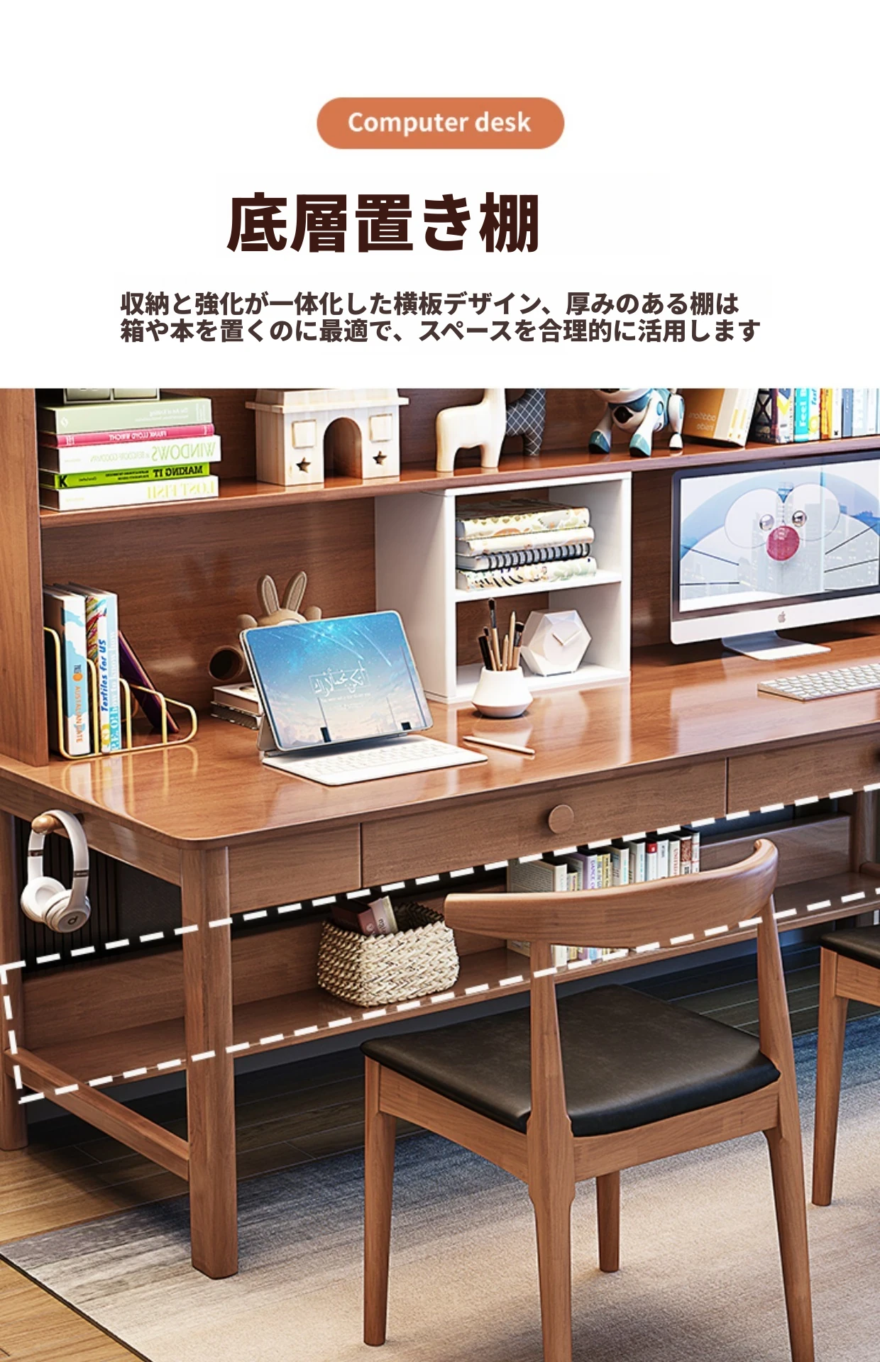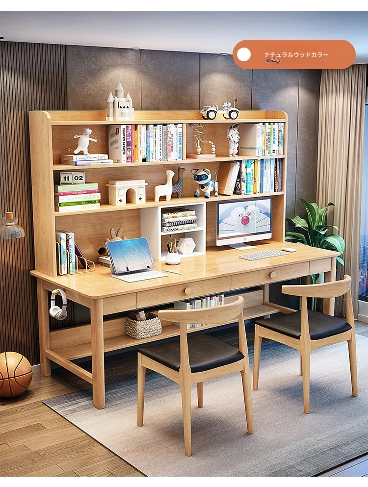 ウィンノー無垢材ダブルデスク&本棚一体型 スタイリッシュなオフィスデスク 家庭用・リビングに最適な並列学習・執筆デスクセット 快適な作業空間を実現!