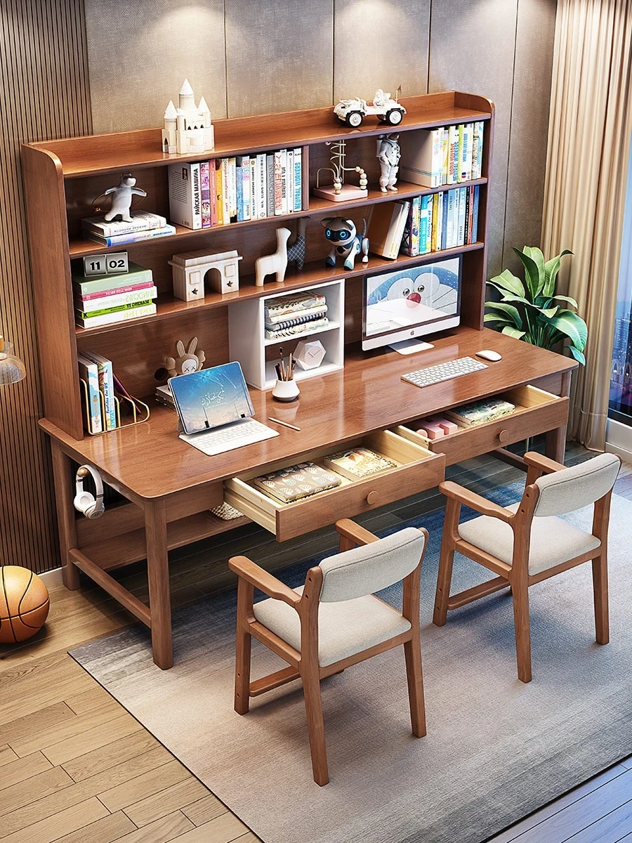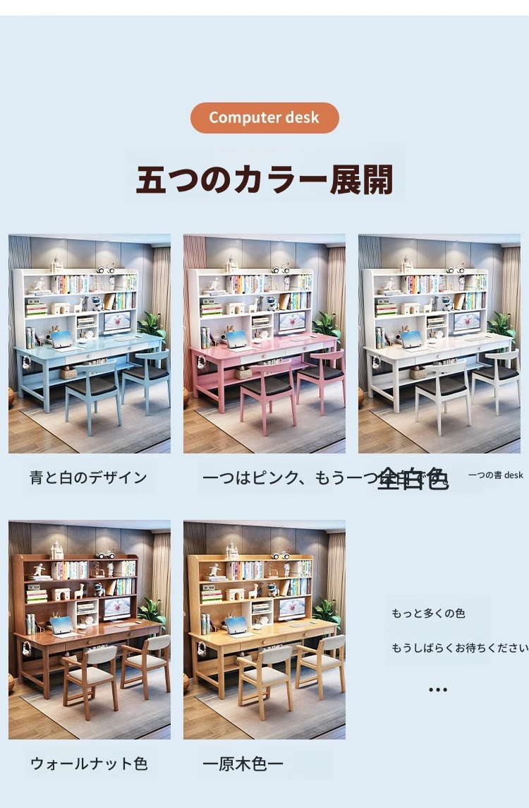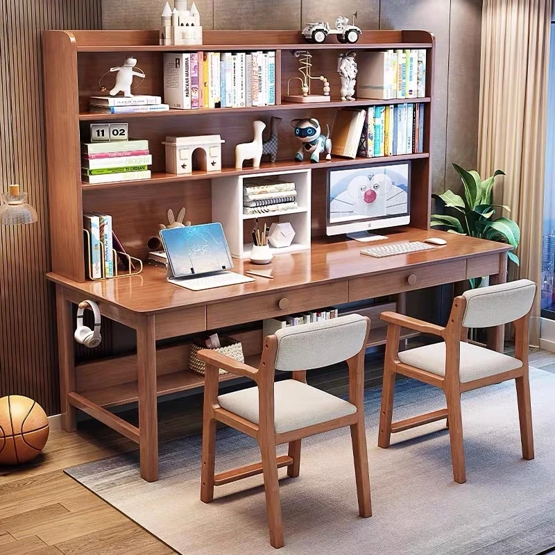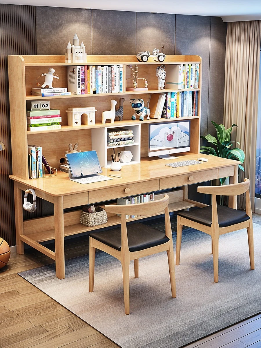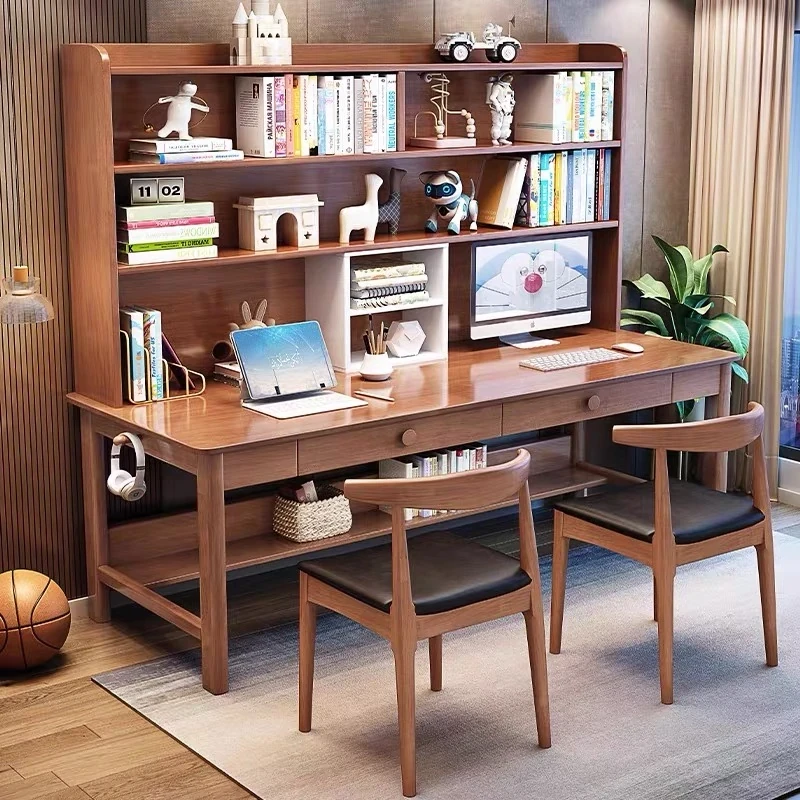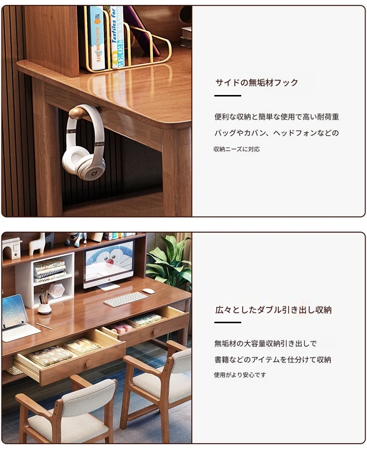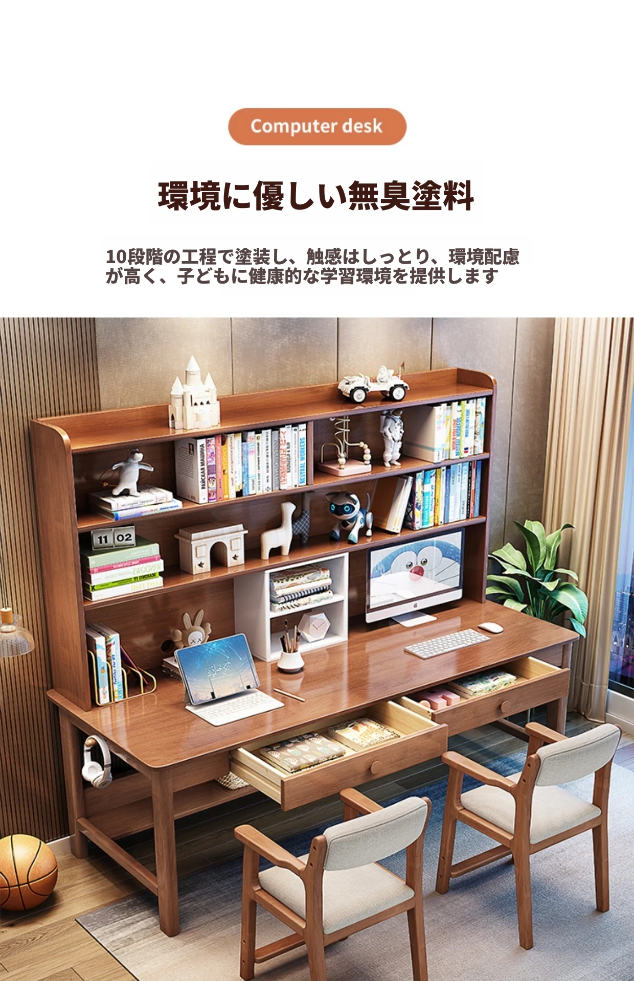 ウィンノー無垢材ダブルデスク&本棚一体型 スタイリッシュなオフィスデスク 家庭用・リビングに最適な並列学習・執筆デスクセット 快適な作業空間を実現!