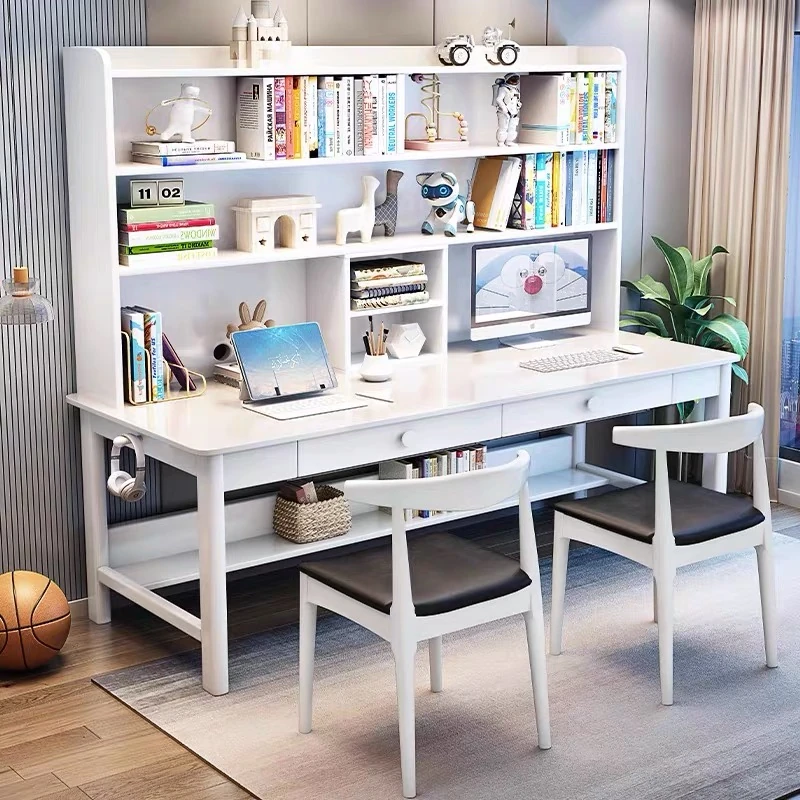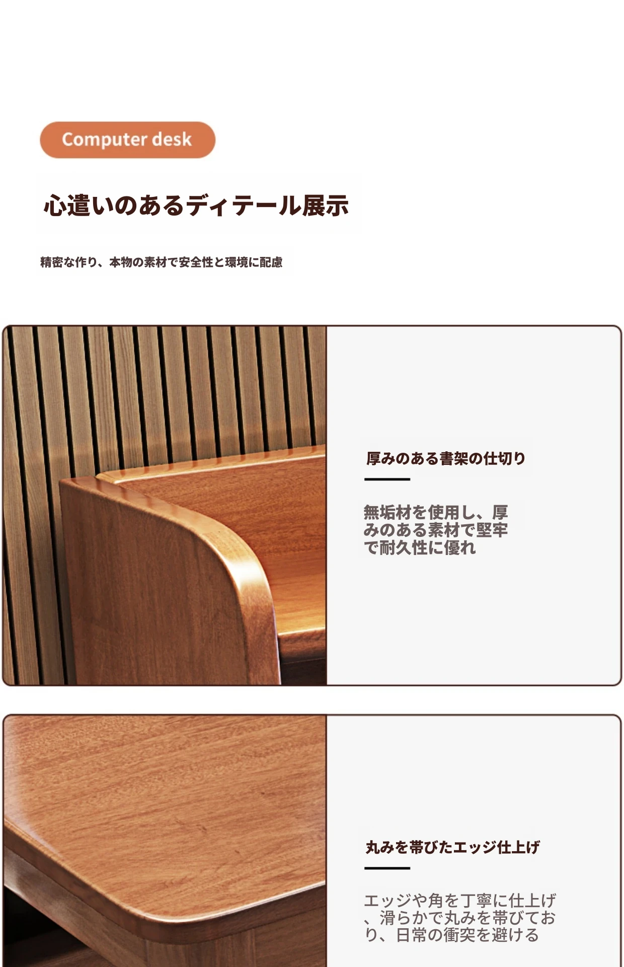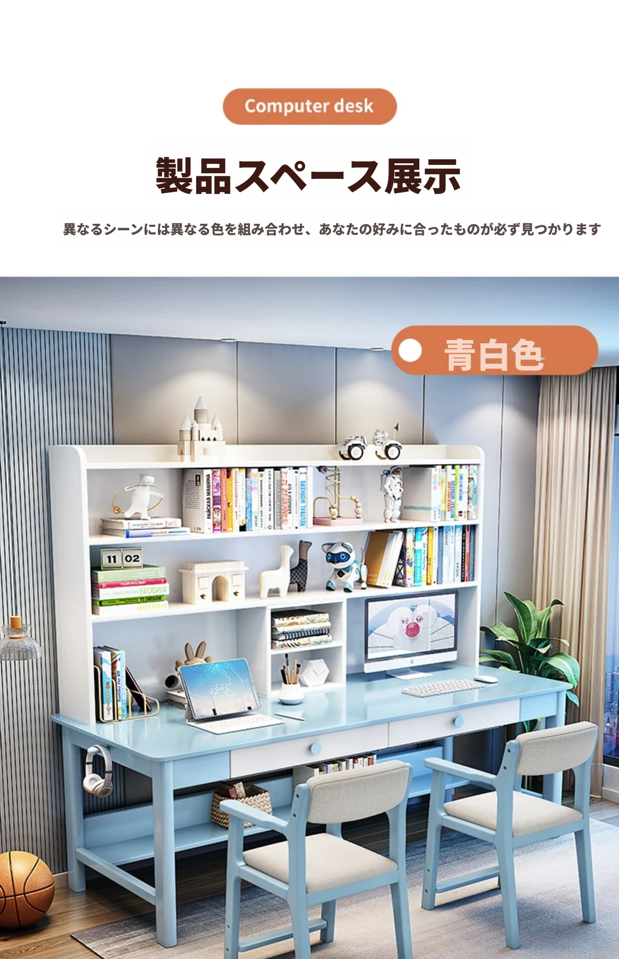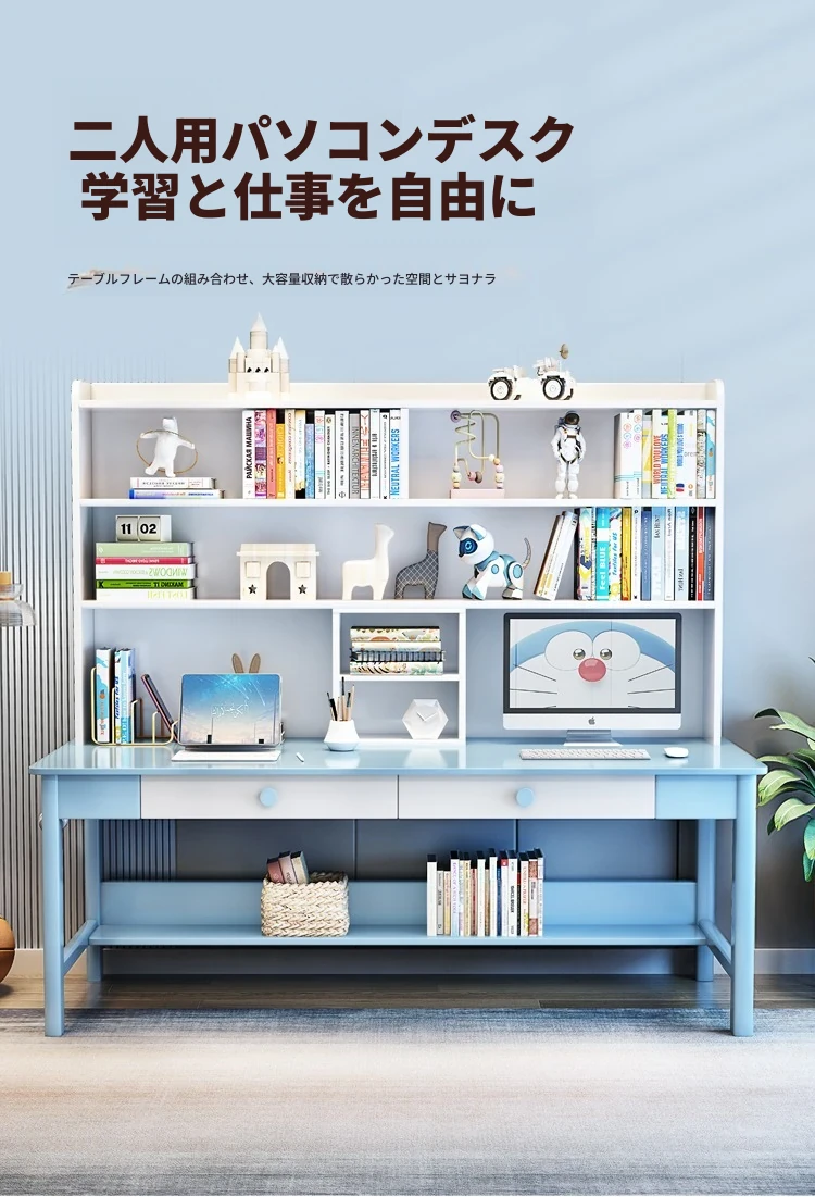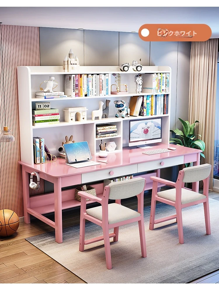 ウィンノー無垢材ダブルデスク&本棚一体型 スタイリッシュなオフィスデスク 家庭用・リビングに最適な並列学習・執筆デスクセット 快適な作業空間を実現!