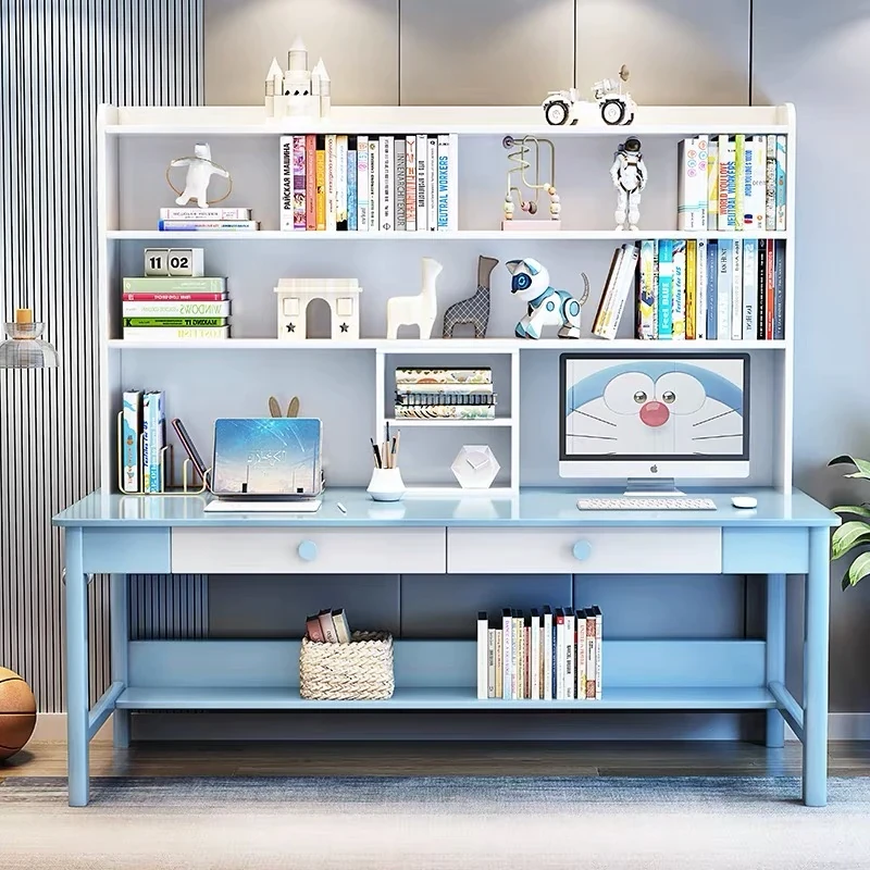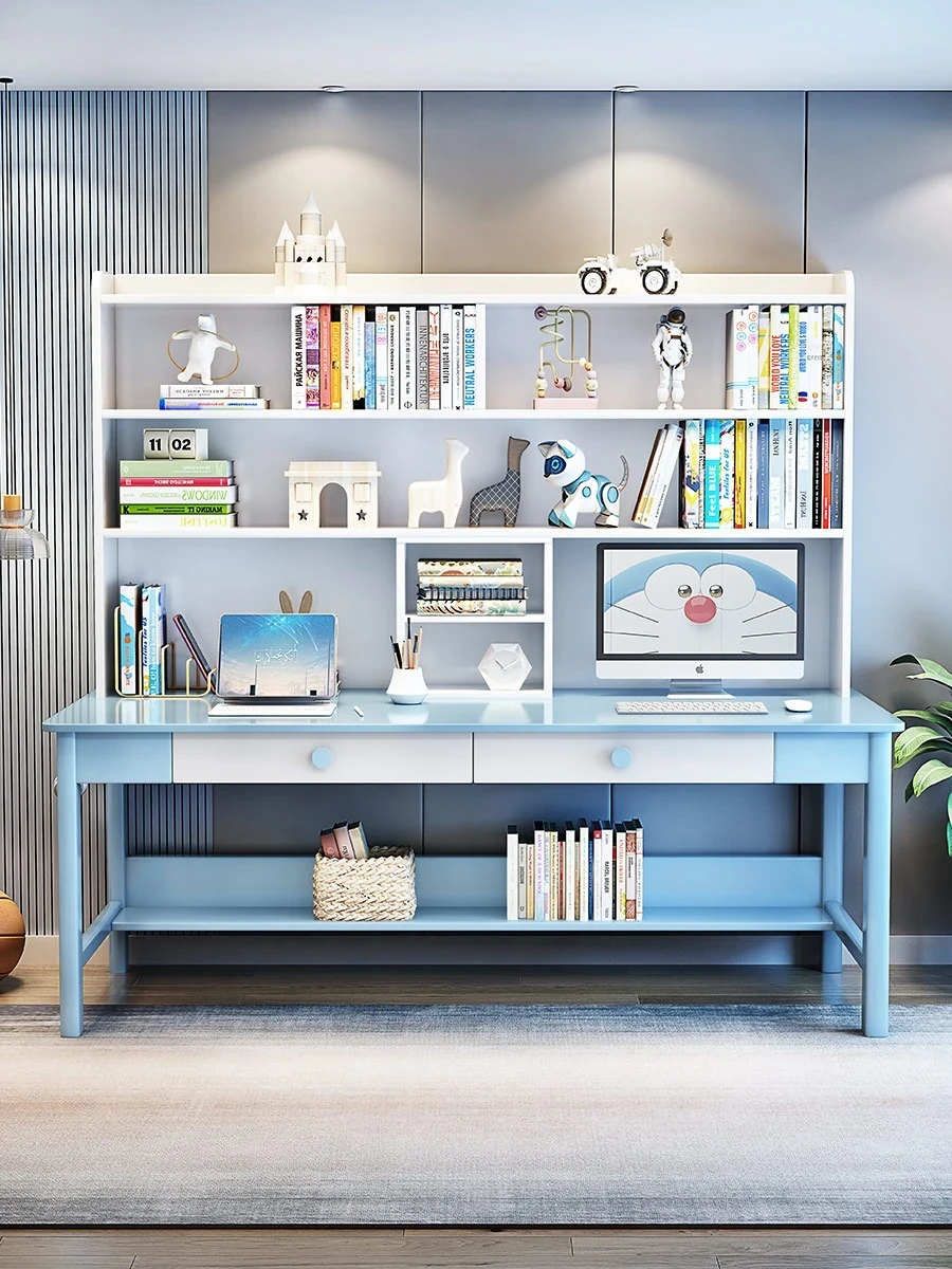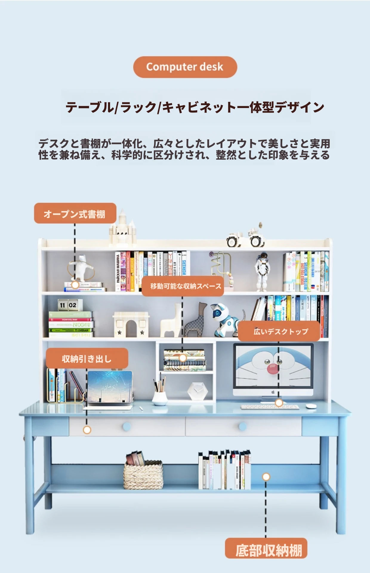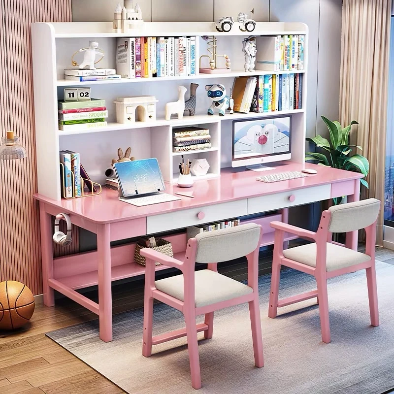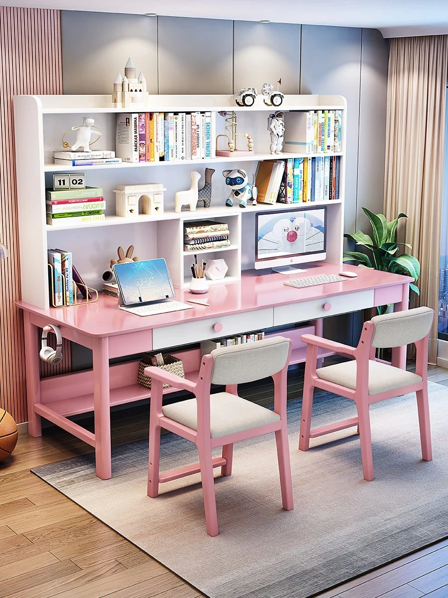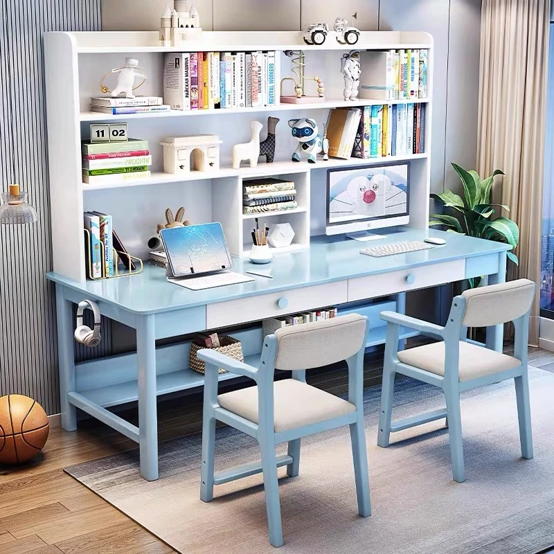 ウィンノー無垢材ダブルデスク&本棚一体型 スタイリッシュなオフィスデスク 家庭用・リビングに最適な並列学習・執筆デスクセット 快適な作業空間を実現!