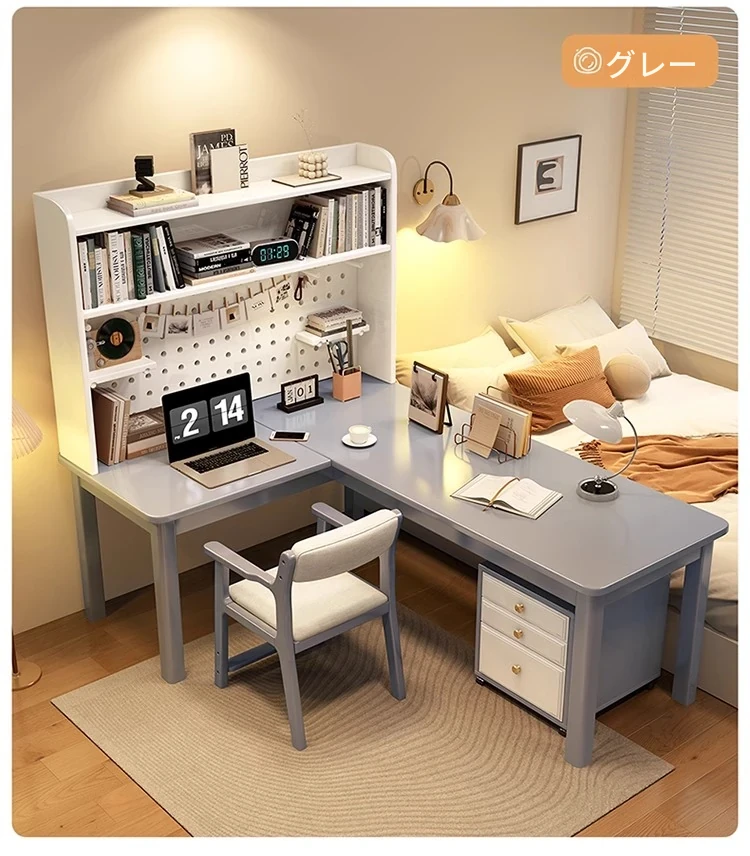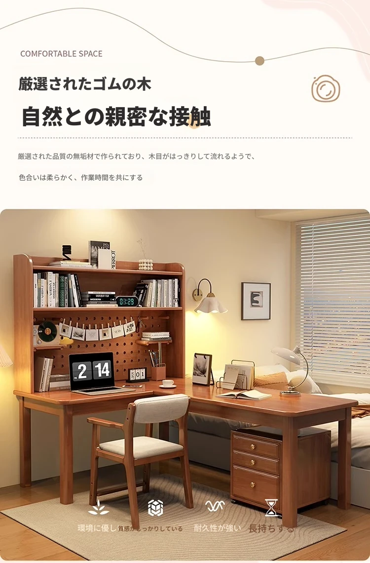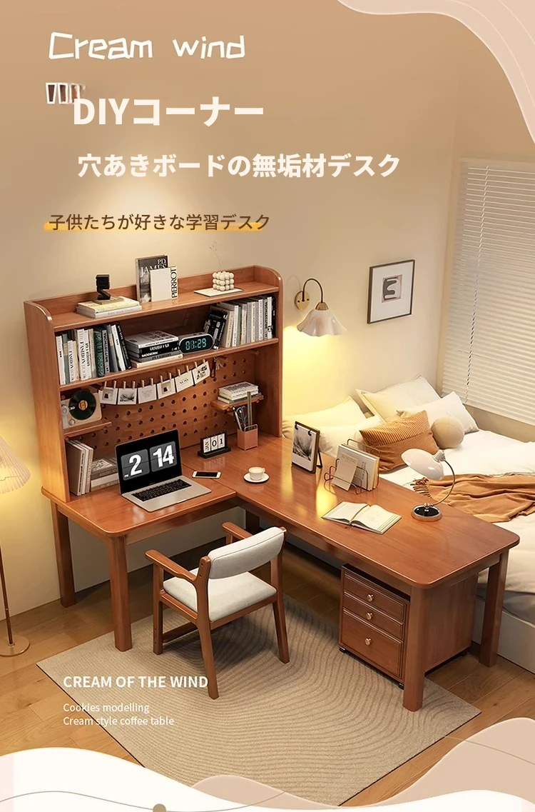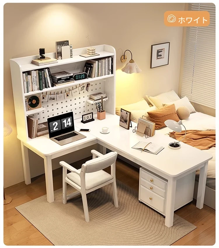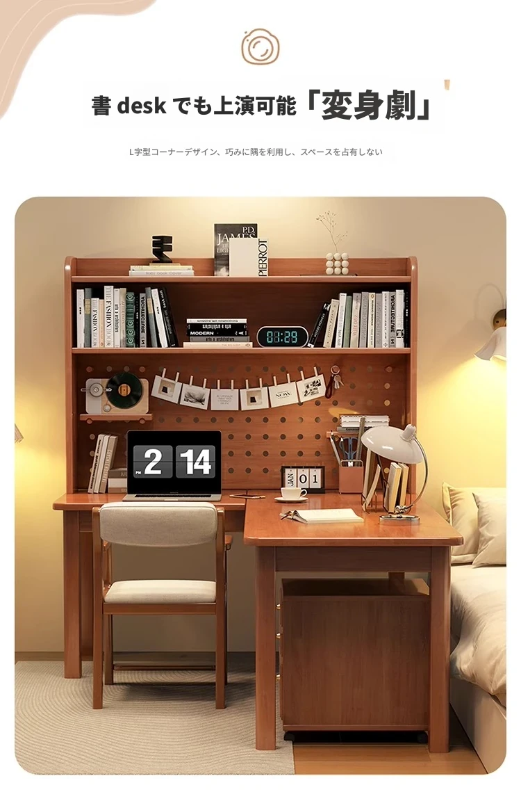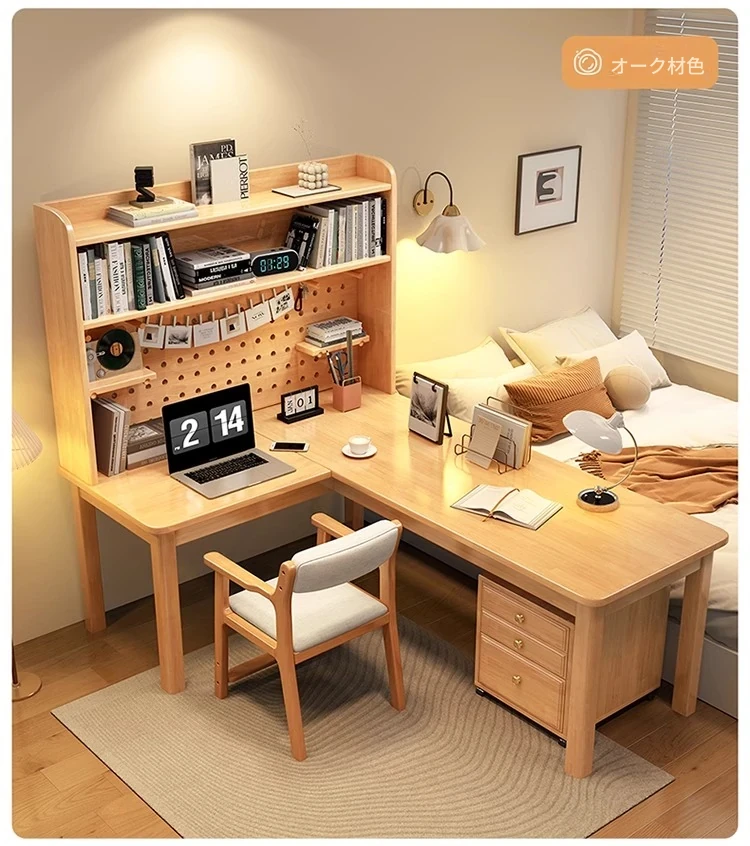 玉菲実木L型コーナーデスク&書架一体型 - 穴あきボード付き、オフィスでも家庭でも使える理想的なスタンドアップデスク!おしゃれで機能的、勉強や仕事に最適な角型パソコンデスク。